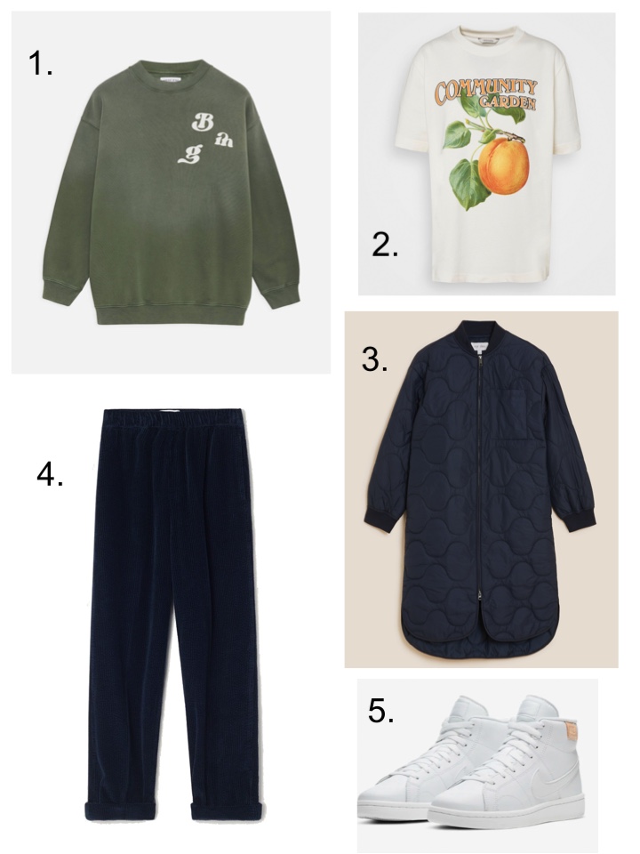 Finally, a little bit of the lounge. Always a fan of Anine Bing sweatshirts for this look. They tend to come up BIG so go down a size if you don’t like things too oversized. Also loving these American Vintage elasticated-waist cords, halfway between joggers and trousers. Perfect at-home gear.
