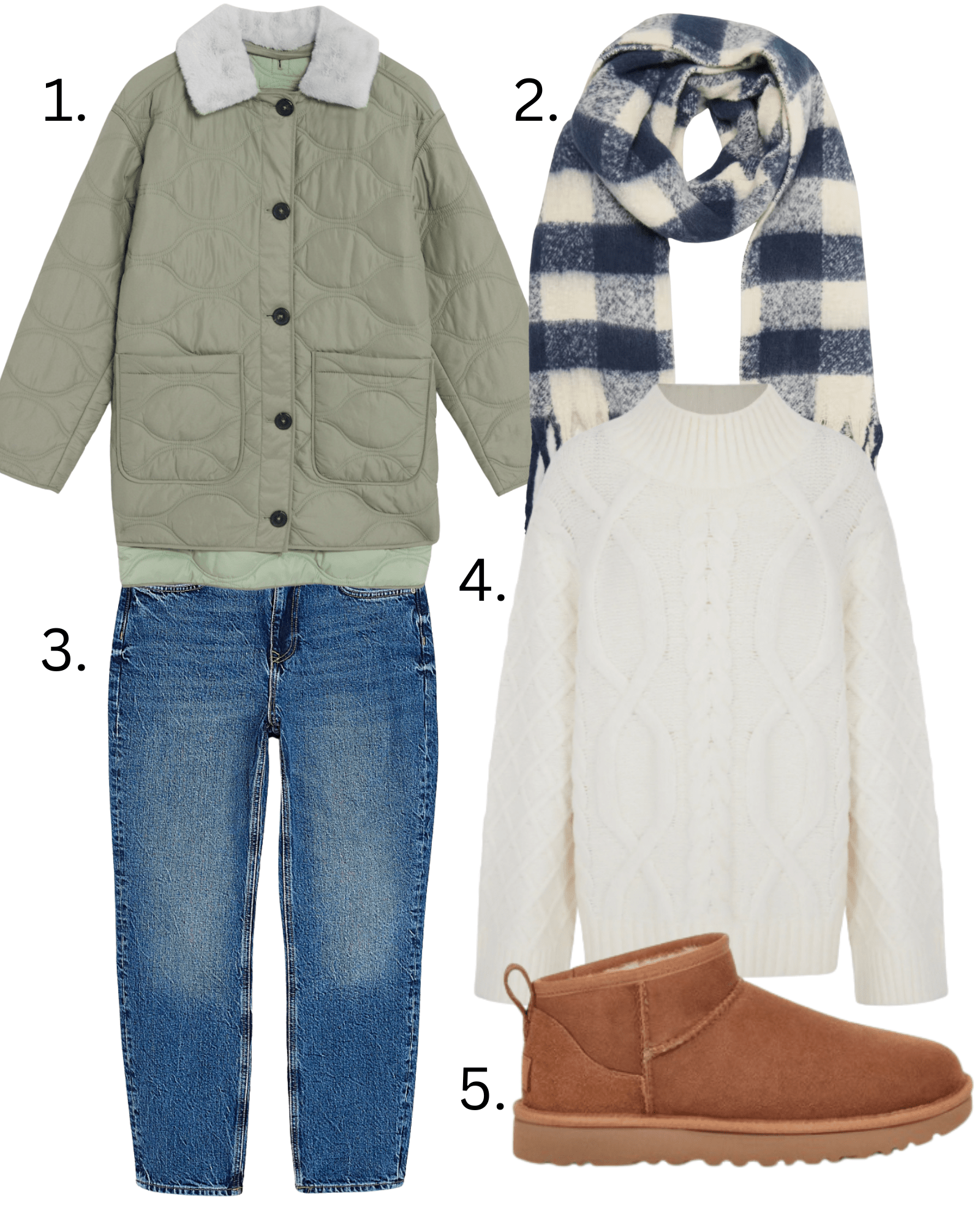 Ugg boots?! I hear you cry. Yes, they are back. Did they ever go away? Well no, but I certainly haven’t worn any for a good few years so let’s call it a comeback. The ultra mini version is what’s driving this trend, but I also like the mini ones too. Pretty much every high street shop is doing a version of these this year. However, beware of really cheap ones that give no ankle support and the heels collapse – they’ll be no good for you in the long run. And we’re not wearing them with floral tea dresses anymore either. That look is best left in 2002. This time, let’s go for a cream cable knit and a green quilted jacket.