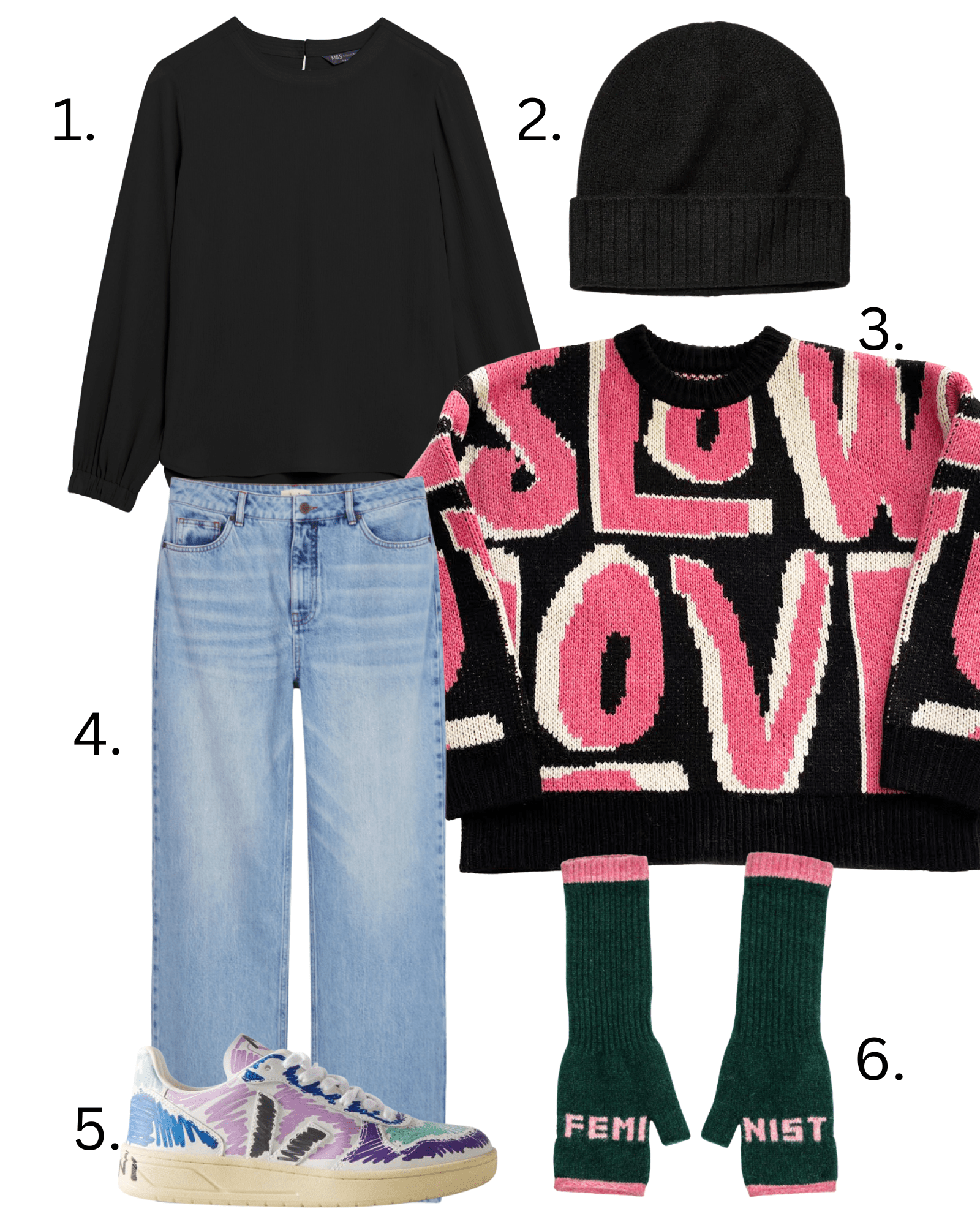 I’m dispensing with a theme this week and have just gone for six outfits to wear right now. I’ve been taken with some excellent knitwear, but in reality it’s been almost too warm for sweaters this past week. Even in the far north. We’ve been on a half-term break in Northumberland* again and I packed for the bleak midwinter (as that’s what the weather was generally like when we came in August over the past two years!) but no, it’s been positively balmy. No need to light the fire, and I’m writing this wearing a T‑shirt when I had expected to be sporting a chunky knit. But I’m not complaining. I would always rather be too hot than too cold. And with the hot flushes I get on a regular basis, it’s lucky I feel that way.