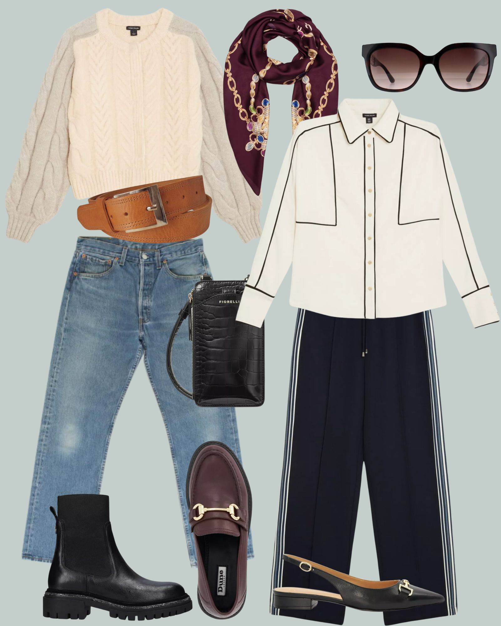 The pleated skirt is making a bit of a comeback this season. If you can do a heel, then a knee-high, block-heel boot would work well here, or if you’re like me and prefer comfort over all, a fancy flat or a pair of loafers would be my top-two choices. I’m also seeing more V‑neck sweaters around this year, which I would wear with a simple vest top underneath. My friend Arlene tells me this one from Mint Velvet is THE perfect vest. I’m yet to try it but I do believe most things she tells me so it’s inevitably a winner.