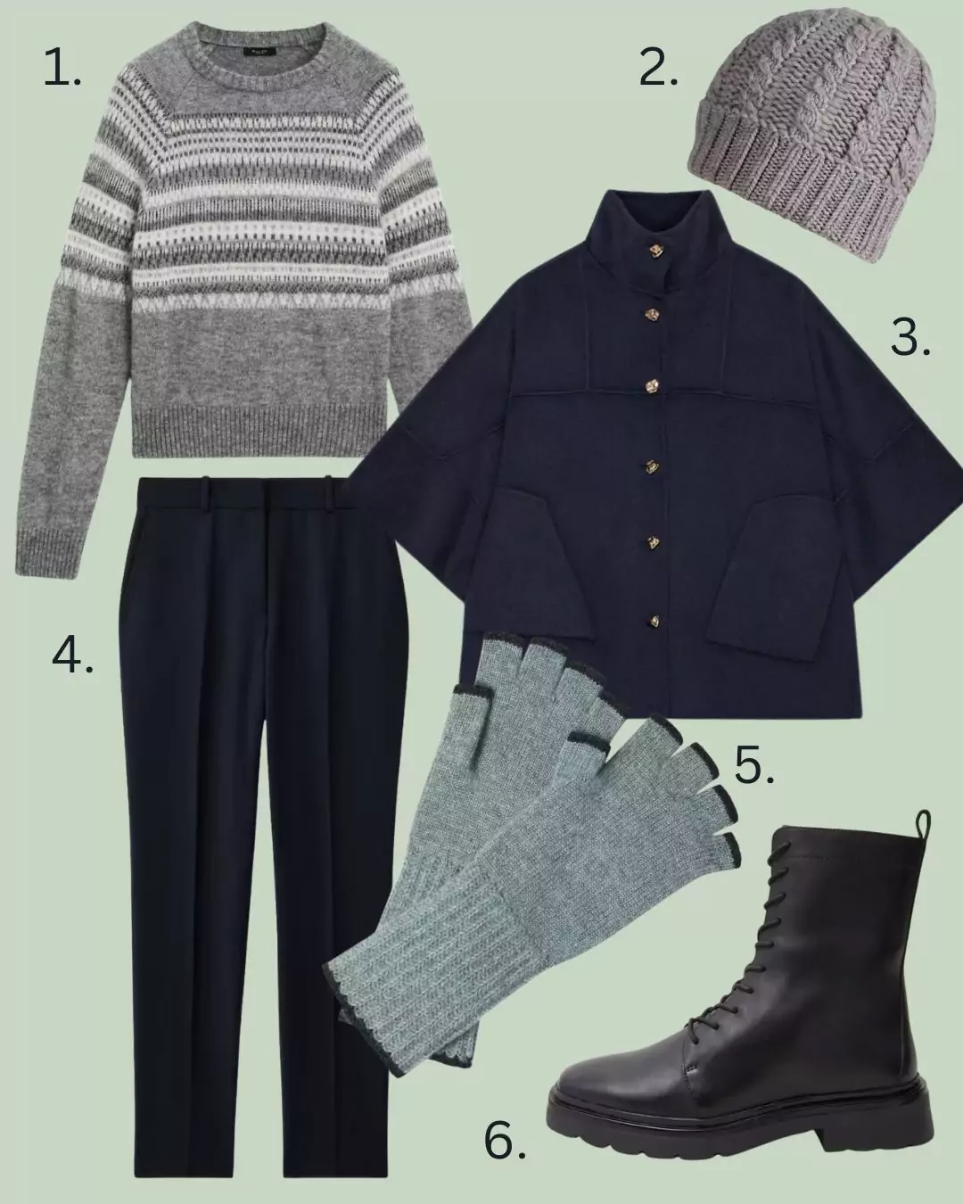 The easiest – and, in my opinion, most useful – item to get the look is a good pair of fingerless gloves or wrist warmers. I prefer these to full gloves as you don’t have to keep taking them off to do things. I often wear my wrist warmers all day, and you’d be surprised what a difference they make to your body heat. My favourites are from Brora for the mire traditional style or Black & Beech for a more left-field feminist feel. Obviously you’re not obliged to pair them with a cape, but I’ve found a few anyway.