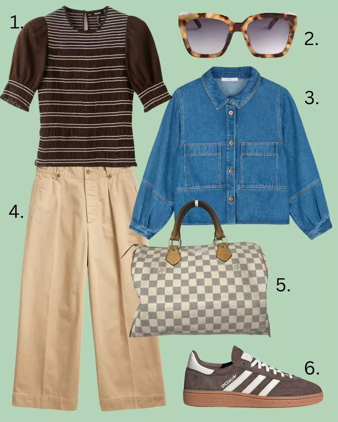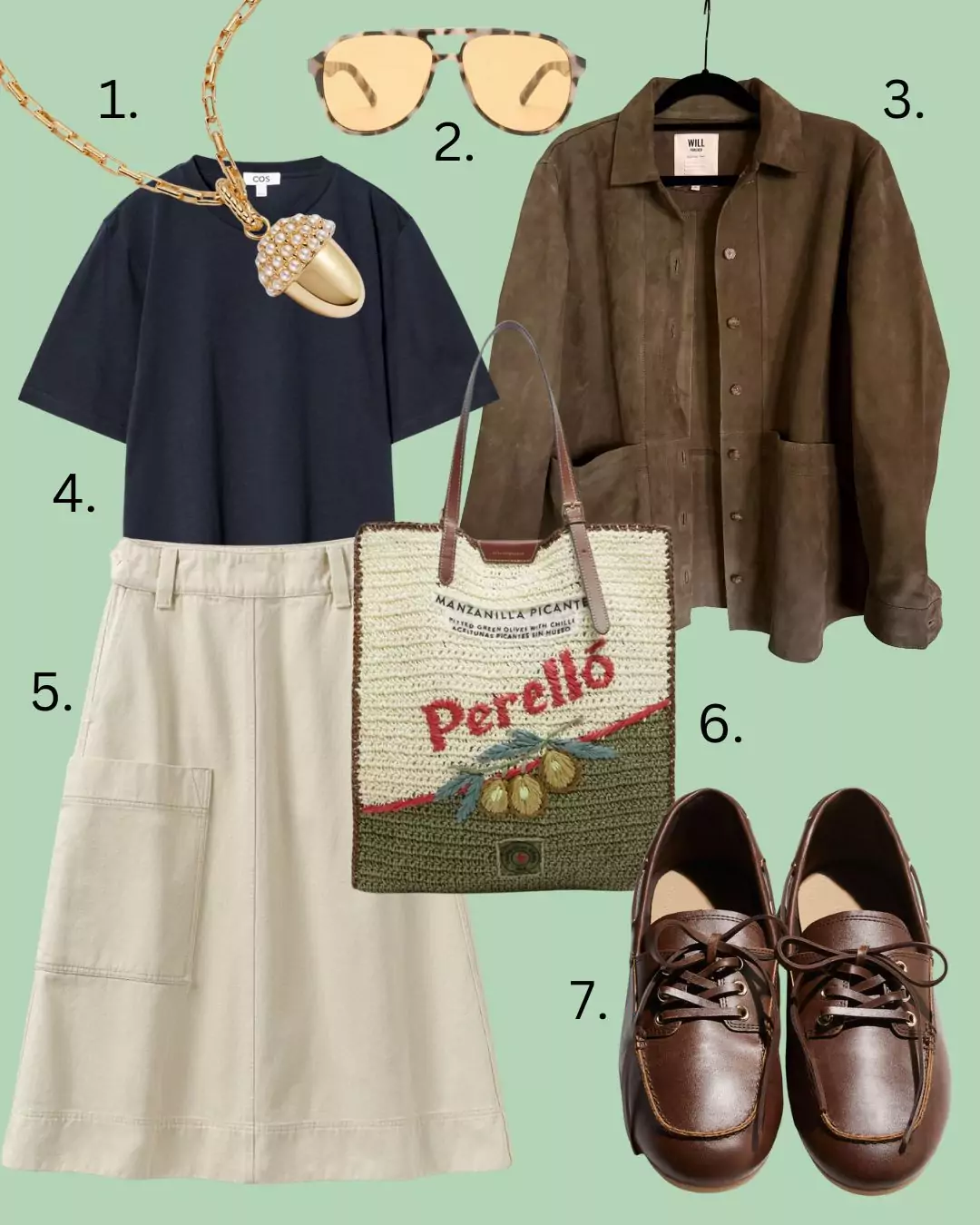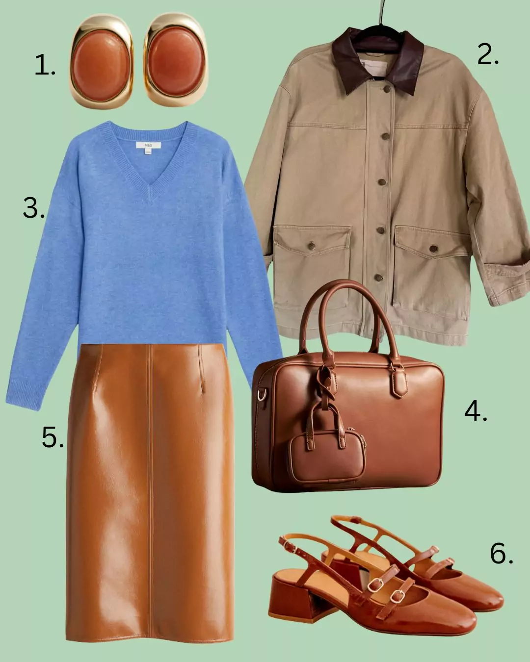 A caramel pencil skirt, pale blue knit, barn jacket and bowling bag is straight off the Miu Miu A/W 2024 runway. Now it’s trickled down to the high street and this colour mix is right up my strasse. If a brown plastic skirt isn’t to your liking, you could wear this outfit with some brown jeans or trousers instead. Which is what I will be doing.