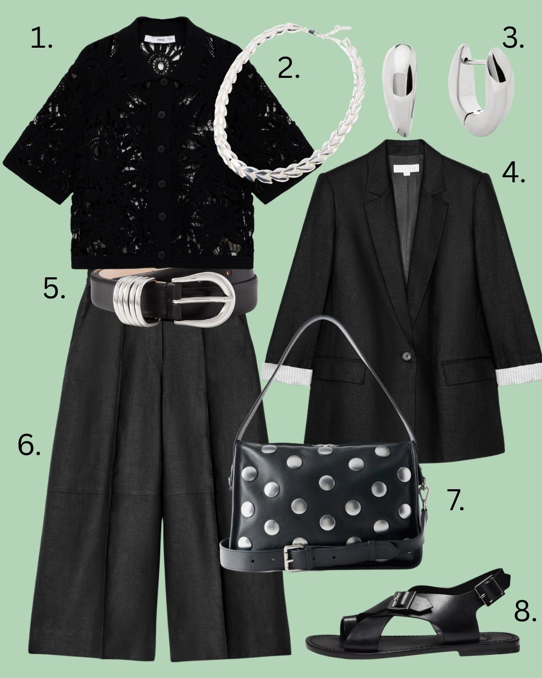 If you love black but you worry about looking a bit flat, go for something with a bit of texture and shape. A crochet or lace top will fit the texture bill nicely, and these wide linen culottes from COS are a step up from your regular pair of trousers, giving you a more edgy look without having to add any colour at all.