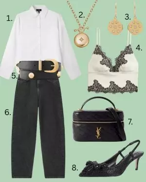 Looking for an effortless evening look? I mean, aren’t we all? Pair your black jeans with your white skirt. Jeans are different to trousers: I don’t fear a black jeans / white shirt combo in the same way. Wear a lace cami or bralet underneath and add gold accessories. I’m a recent convert to H&M bralettes: they’re great, give decent support and are nice and pretty. I have this one, and this (in black and white), and I’ve also just bought this bandeau bra that is actually better than the Skims one I tried, plus it’s less than half the price.