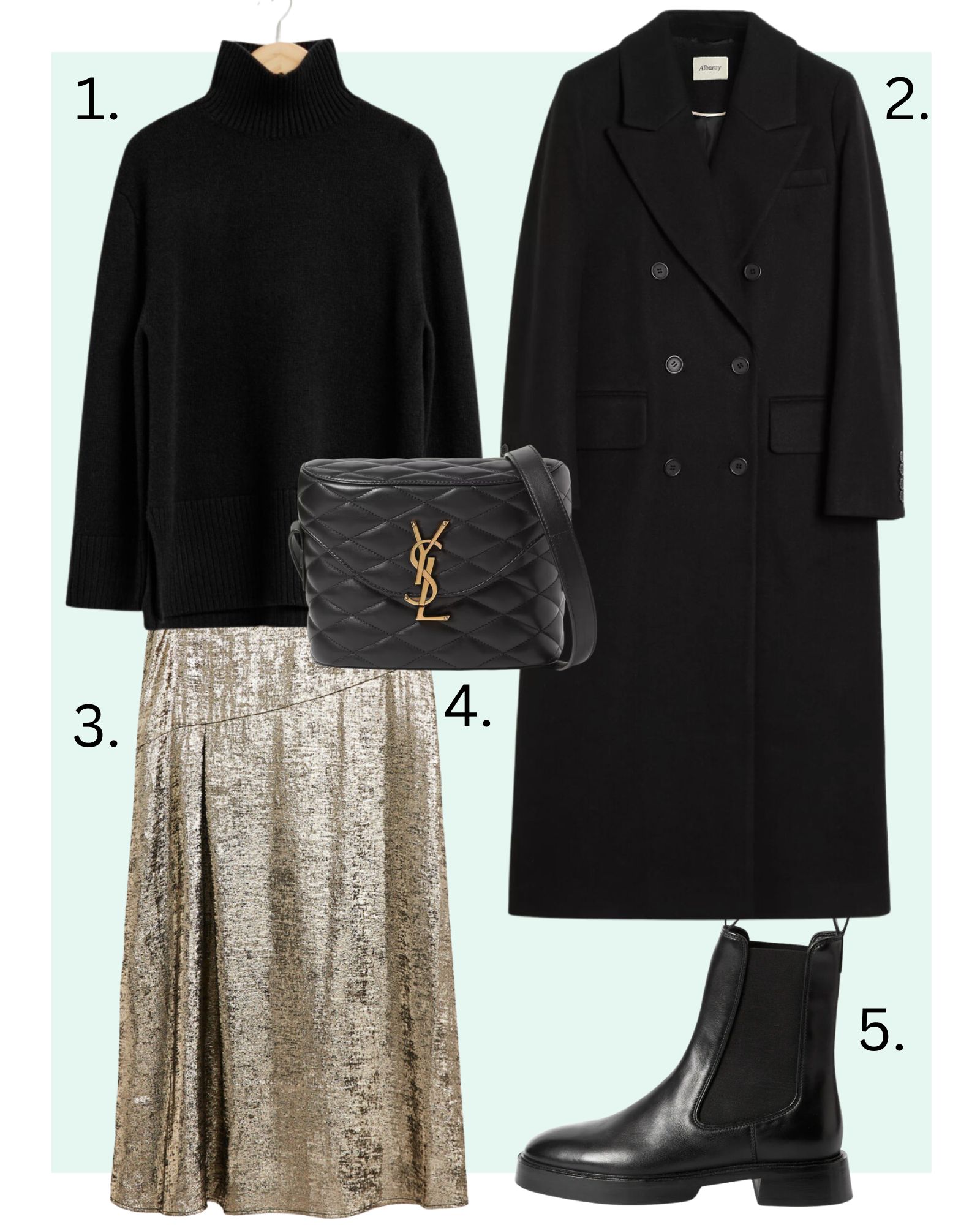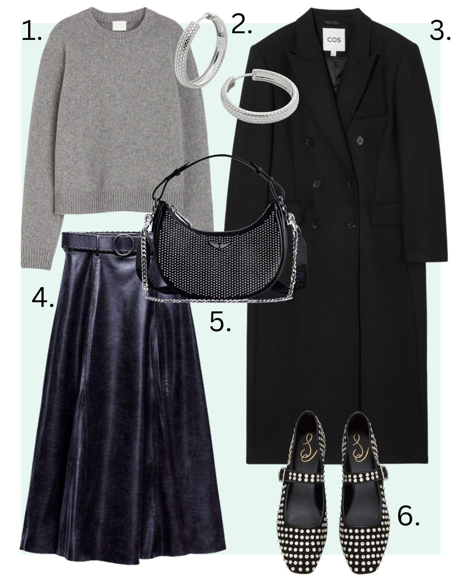 I have noticed a lot of metallic skirts around over the last few weeks. They will, of course, be great for party season with a good blouse or a camisole top and a heel or a fancy ballet flat, but I think you can get away with wearing them for daytime too. Keep the rest of the outfit simple: just add some good, classic, plain knitwear and an oversized coat.