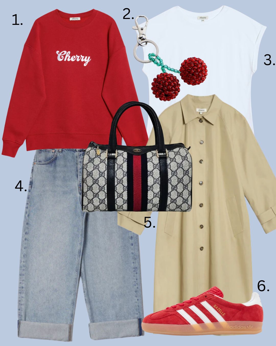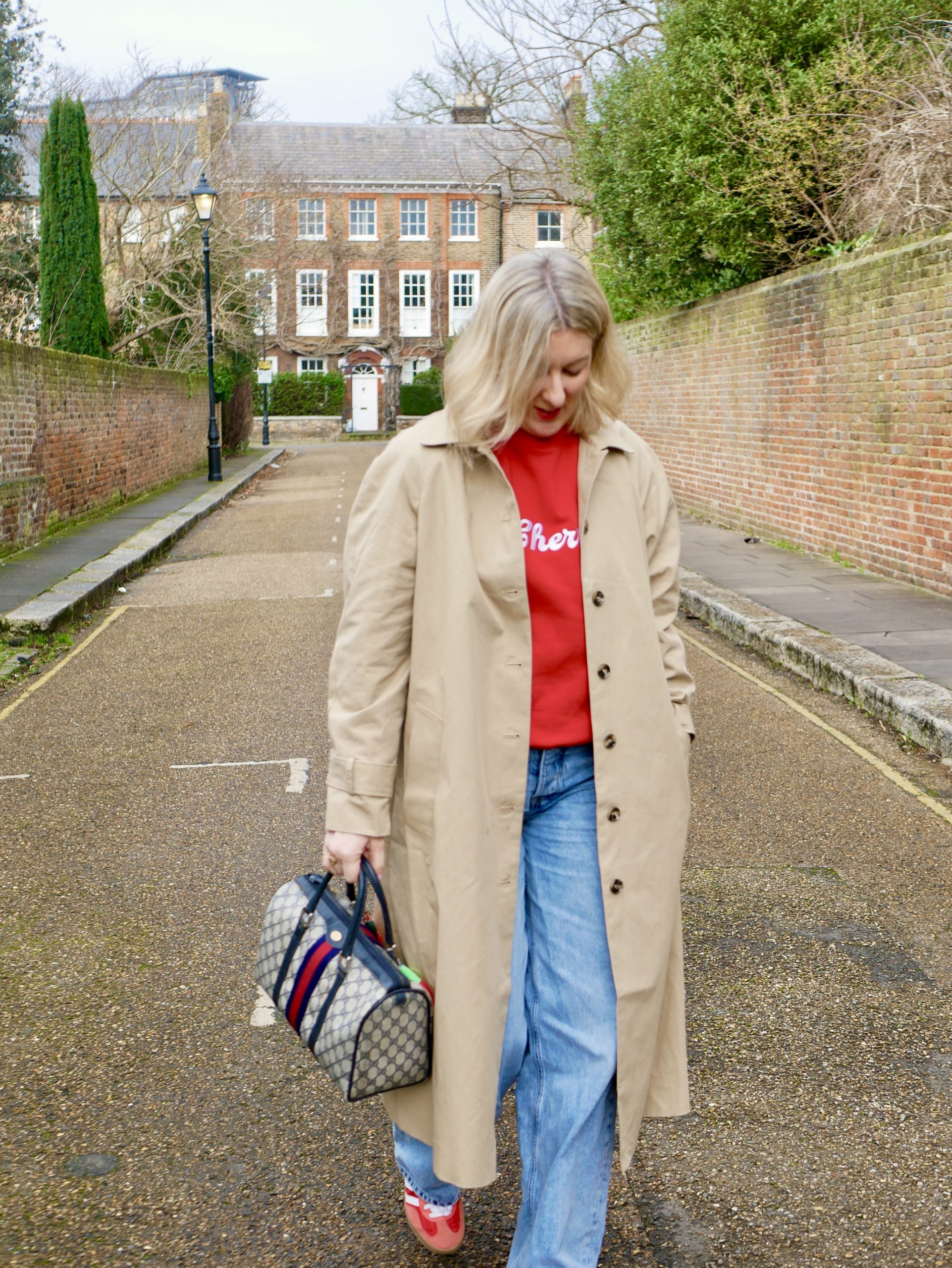 It’s been a while since I’ve found a really good sweatshirt. I like something simple but not TOO plain, so this Cherry sweat was an immediate top ‘pick’ for me (pun intended). It’s also tapping into the pop of red that I’m still favouring. I’ve tied it in with some red accessories and I wore it the other week with my old Albaray wide leg jeans (they are these turn-up ones, I just turned them down on that day), and the new season trench.