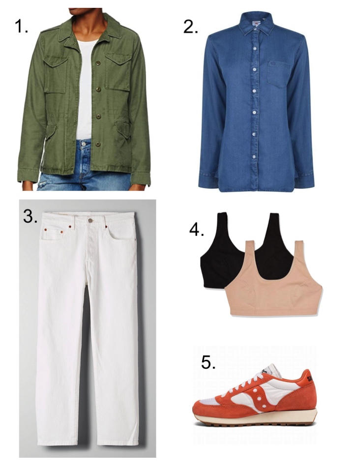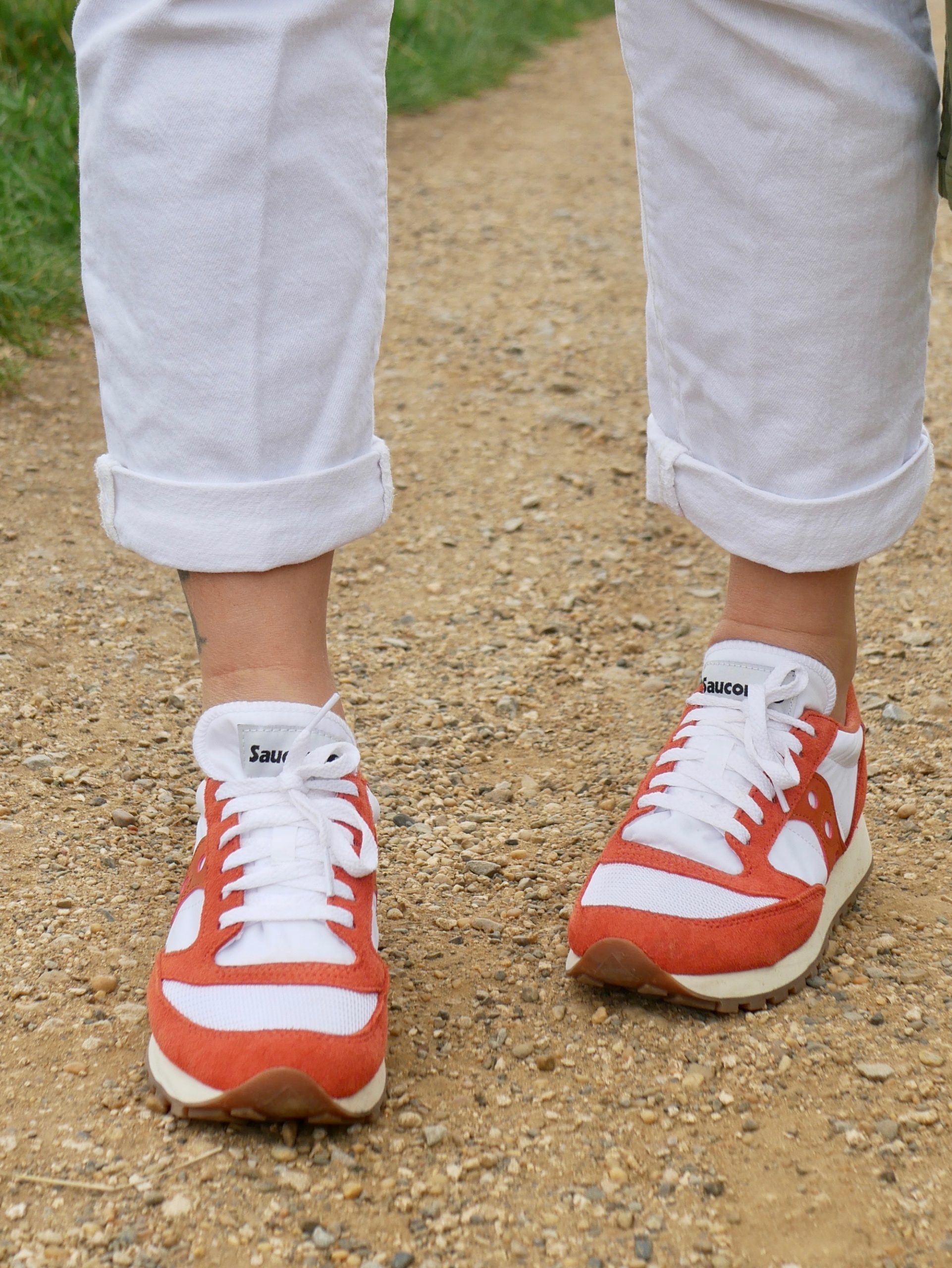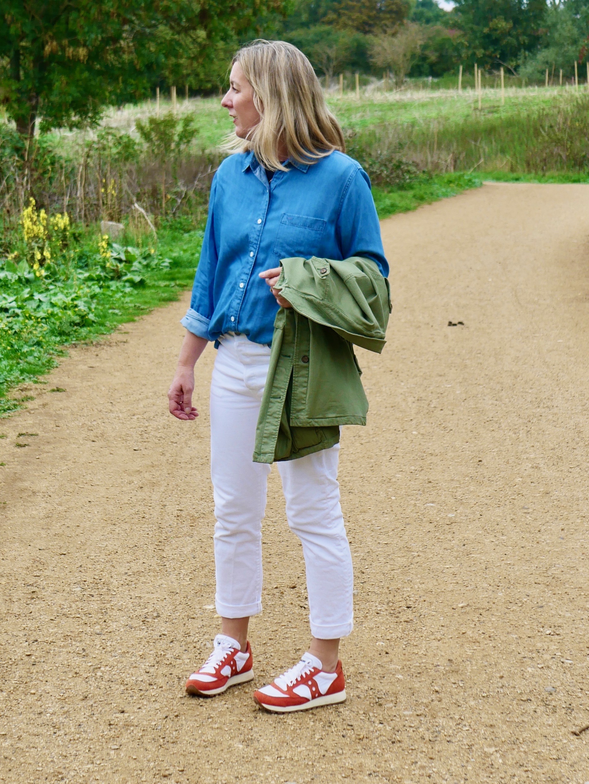 Saucony Trainers are great to add a colour pop to your outfit. They come in so many cool colours and are so light you barely know you’re wearing them. Well, that’s a lie, but you catch my drift. I’ve teamed them with White Levis 501s. They are listed as being cropped, but unless you’re 6 ft, they really aren’t, so I’ve done what I do with almost all my jeans, rolled up the hem to flash a bit of ankle. I’ve featured this Denim Shirt before, It’s pretty much the perfect size, shape and shade of blue to work with a ton of other outfits.