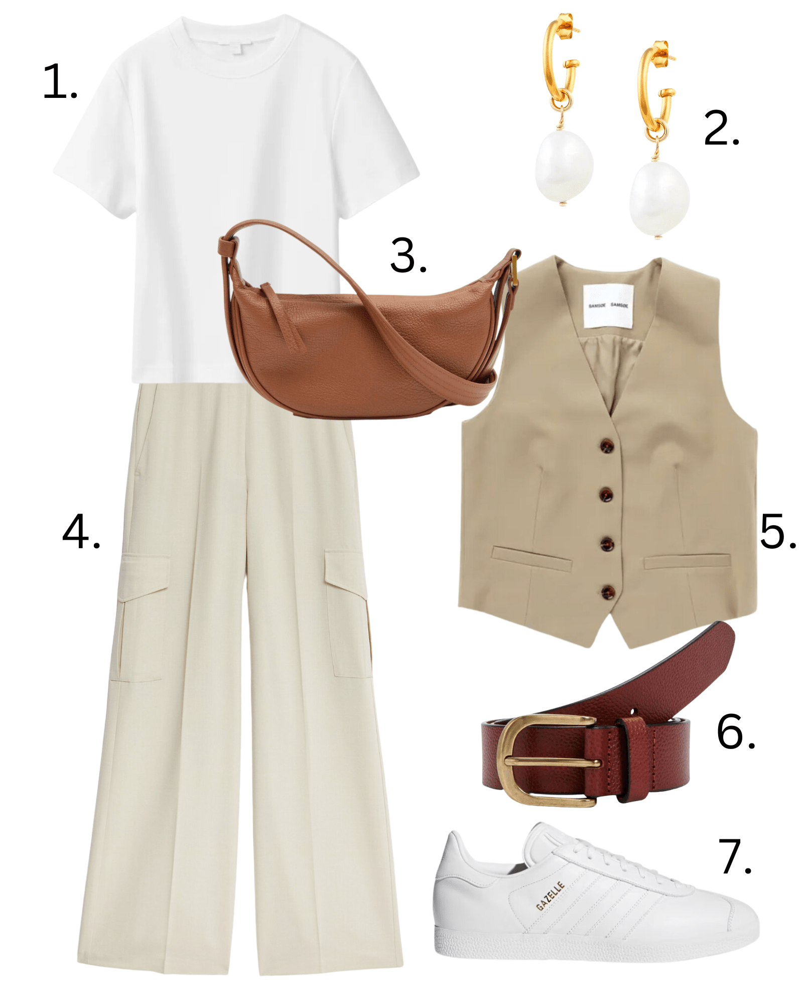 Here’s where I failed on the ‘no trainers’ front, but I just couldn’t see cargo pants (even smart ones) working with a proper shoe. But I think the addition of a waistcoat makes this look work-appropriate. I’ve definitely seen lady politicians on the news wearing white trainers, so if it’s good enough for them… Actually, scrap that: we don’t really want to emulate any politician right now, but simple white trainers are, I think, OK.