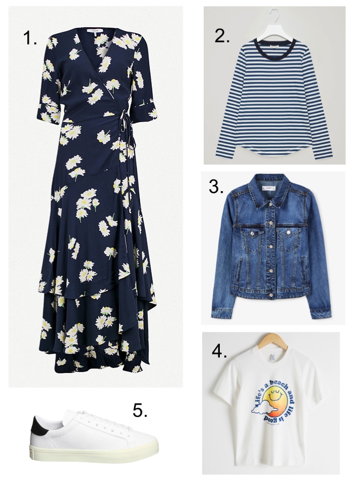This is my favourite style that Ganni do. It comes in many colours and materials. Beware, the wrap skirt has a tendency to flap wide open, so a cooling slip will be your friend in the summer and some secret leggings when it gets colder. I like the way it’s designed to tie on the highest part of your waist, so the fabric skins nicely over the belly, therefore disguising that mum-tum. The one that I really should have got rid of by now, as it’s been 11 years since I had a baby. I like the idea of clashing prints, so will be wearing a long-sleeved stripe top underneath once the weather cools. You must all have one of those by now. I bet you also have a denim jacket to throw over the top too.