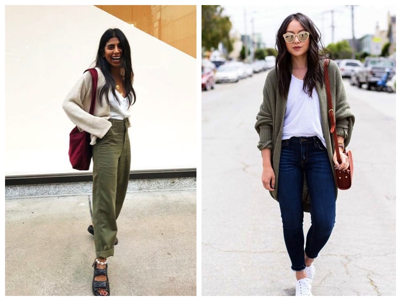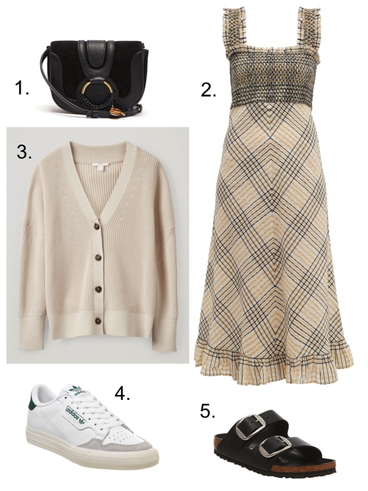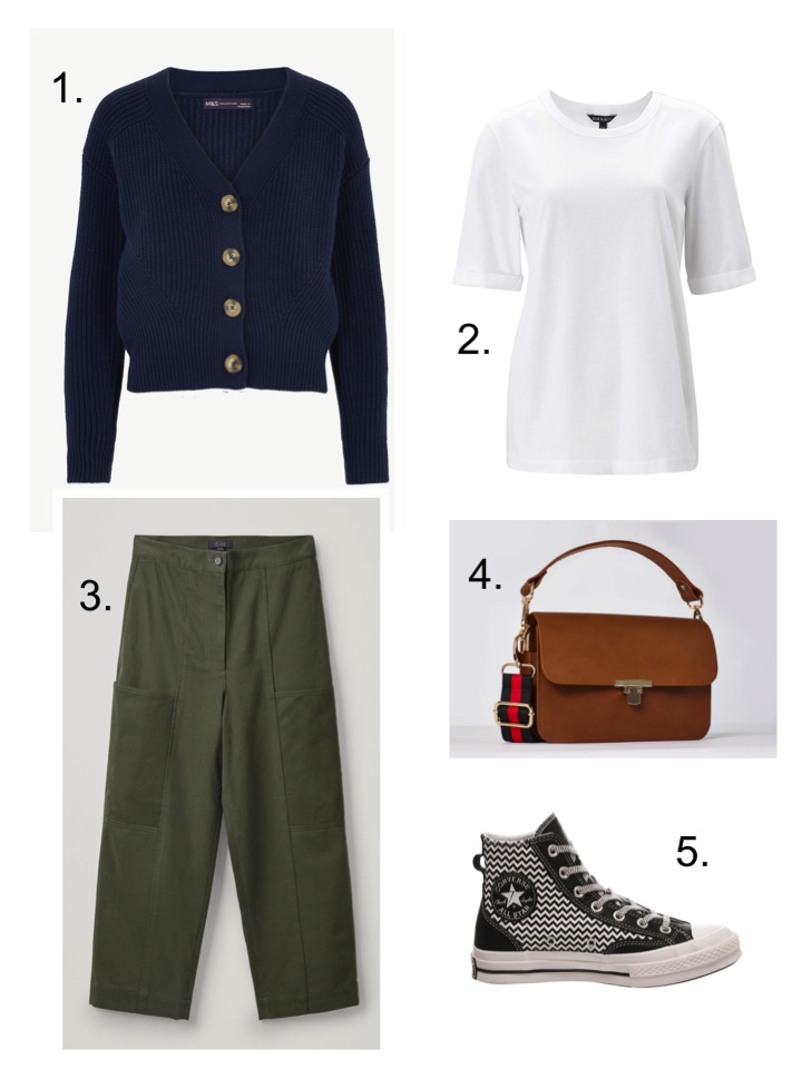 Another outfit that I basically already own, and a very easy everyday look. Pair your chunky navy cardigan with a classic plain white T‑Shirt and Khaki Trousers. These ones from Cos are the most similar I have found to the ones I bought in there last year. Also, these ones from M&S have got rave reviews from those of you who bought them. My favourite plain white T is this one from Baukjen. I also have it in black. How cool are these new Converse? I’ve often had an issue with Converse rubbing on my little toes, not sure why, but I might have to revisit soon.