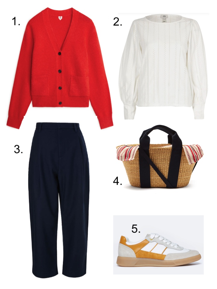 You can’t go wrong with a good pair of Navy Trousers. They are a wardrobe staple for me as they work for all occasions most of the year round. These ones from Kin at John Lewis are ‘Balloon’ style which I know won’t be for everyone, but it is a style I really like. If you’re looking for a more conventional chino style from your navy trousers, try these ones from Cos. Team with a nice bright cardigan like this one from Arket, they do it in a few colours if orange isn’t your thing.