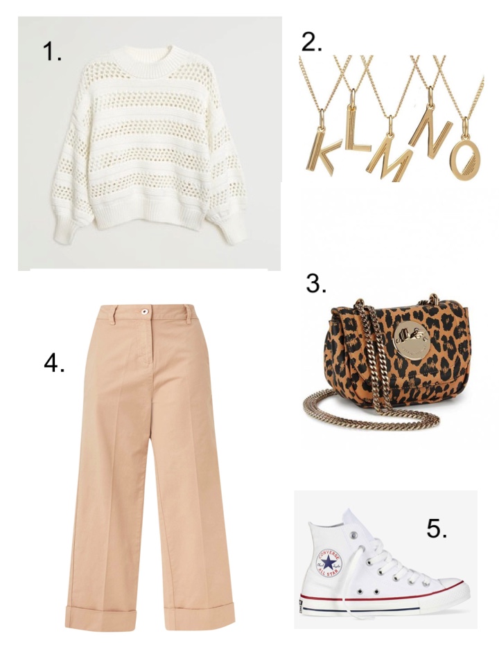 This one could have come straight from the ‘New Neutrals’ blog post a while back. I love a tonal outfit. It just looks classy. This Mango sweater can be worn over a white vest top for now and over a plain long sleeved top when it gets colder. Beige chinos are also a classic. Wear with White now and with Black or Navy come October. A touch of leopard will go with anything at any time of the year.