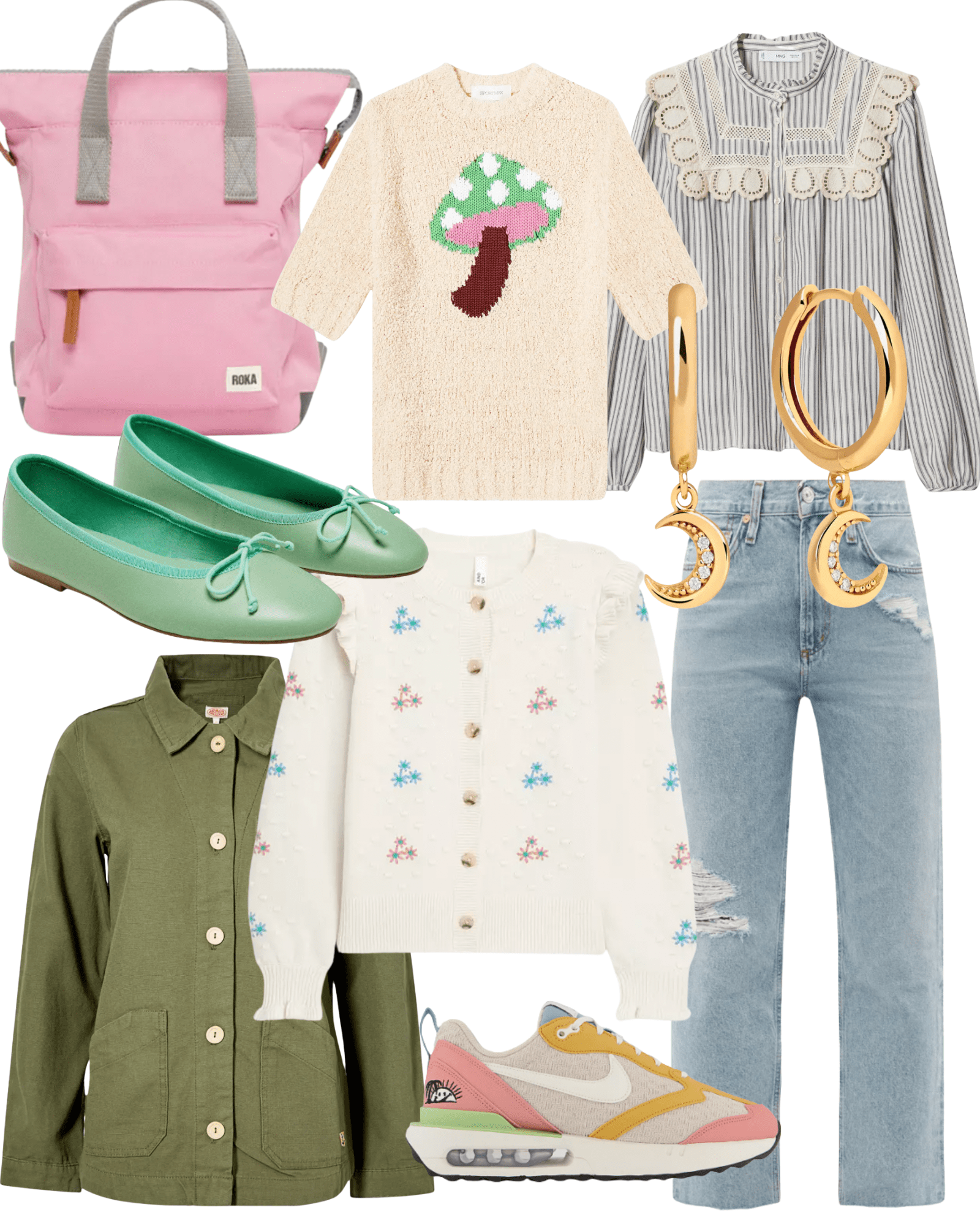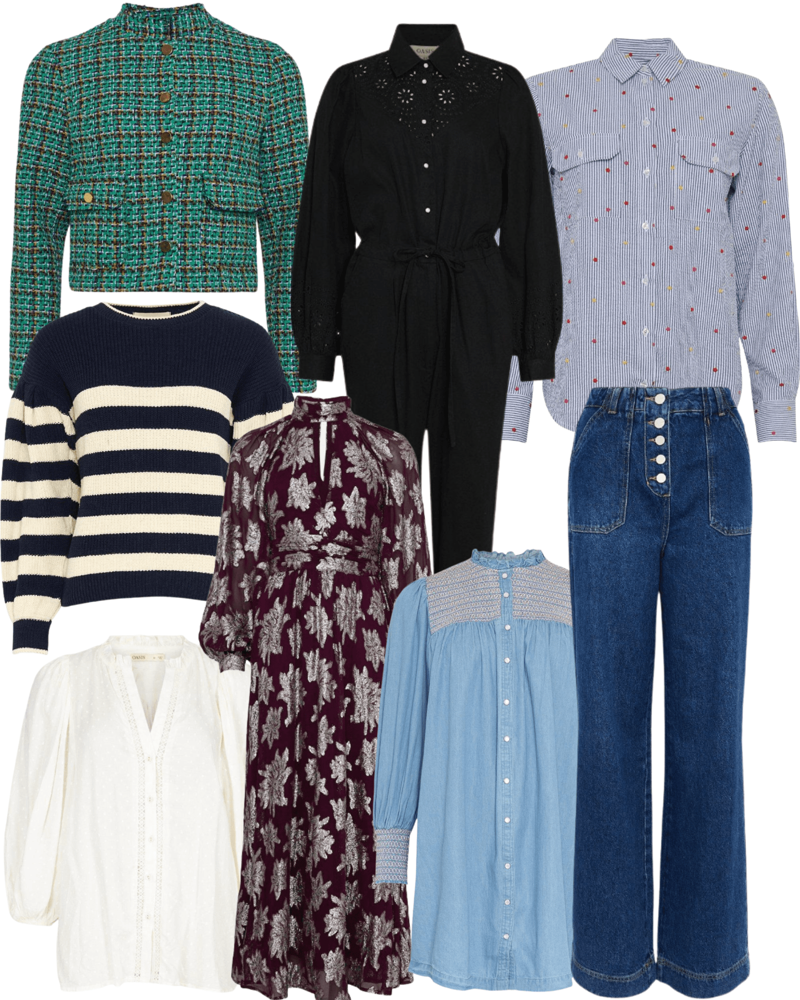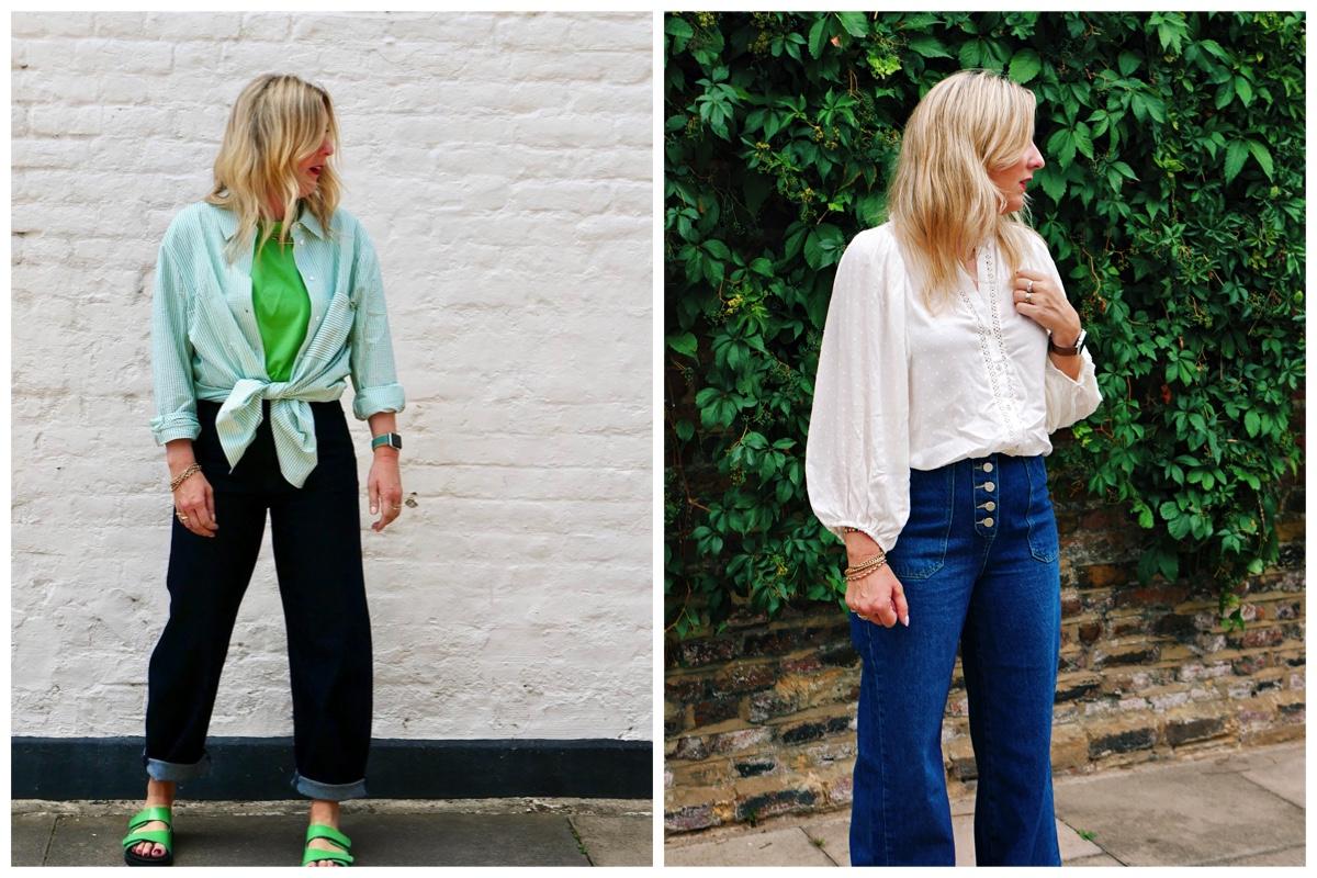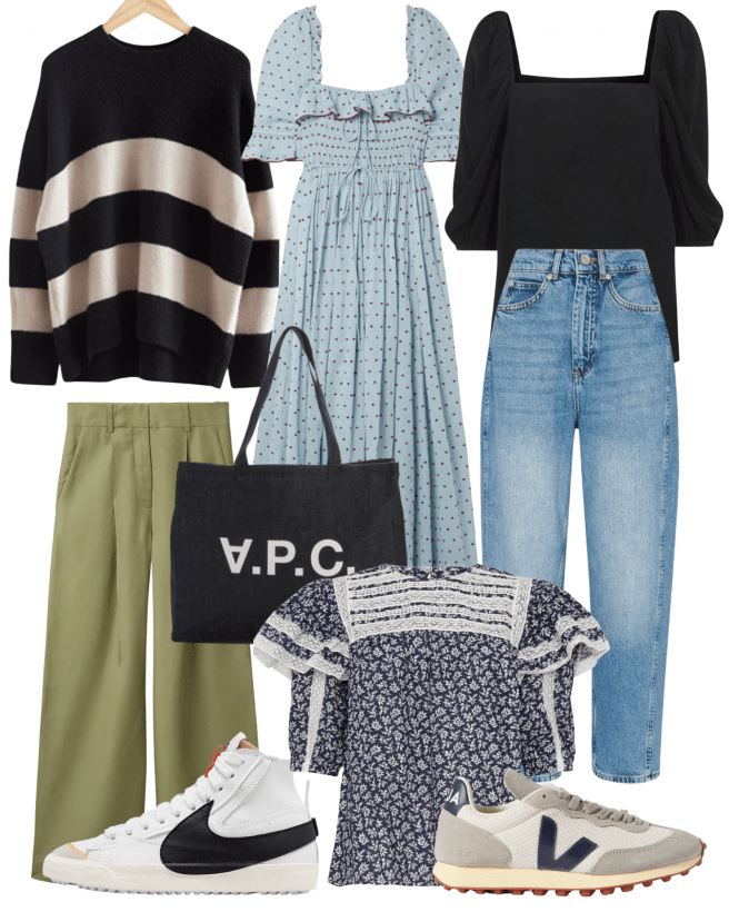What you’re looking for here is a blouse with a widish hem, ideally not too long. If it’s too long it will swamp you and make you feel bigger. I would wear with some high-waisted jeans to give a little shape to the stomach area. As I mentioned before, the higher the jeans, the easier it is to literally tuck your stomach into them. Sezane do some of the best blouses around in my opinion.