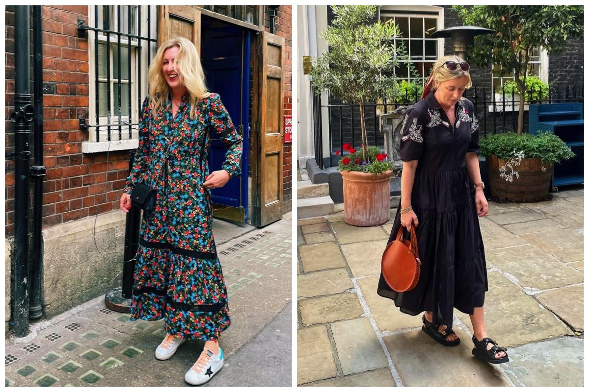 You could go for a buffet dress, but I know that, if you have boobs, they can hang off your top half and make you look even bigger, so the best dresses to look for are ones that have slightly more fit up top and then flow out loosely just above the stomach. We don’t want anything tight. We don’t want any waist belts either. I can never really get to grips with a belt around a dress. Unless I wear it right under my boobs, it only serves to emphasise the lack of a waist. Much like Deirdre Barlow and her signature chain-link belts. For a budget version of the Doen dress below, check out this one.