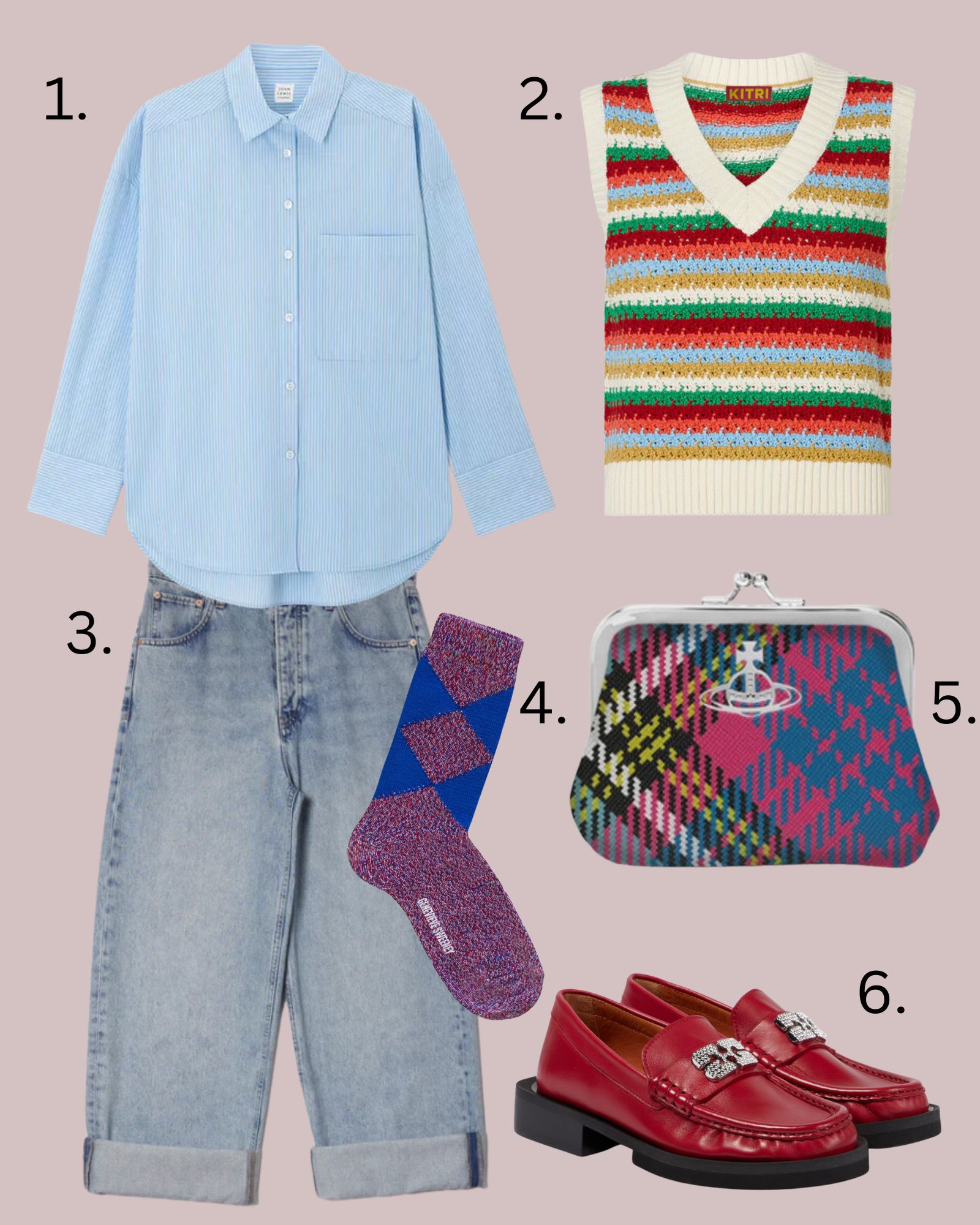 We had to have a sweater vest / tank top / knitted vest / whatever-you-want-to-call-them in here. But for the ‘E’ in the ‘EGC’, let’s make it a brightly coloured one. Pair it with your best boyfriend jeans and loafers. Don’t be afraid to pair colours that you’ve been told don’t go together. I would say that, so long as you have a more muted ‘base’ colour to tie it in with (pale blue in this case), it won’t look like you’ve been taking fashion advice from Rod, Jane and Freddy.