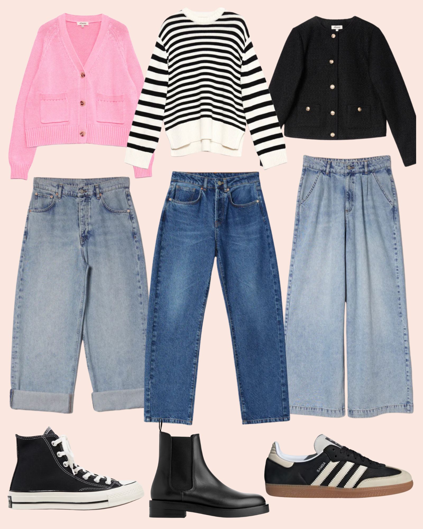 For those of you who are a little wary of clashing colours, here’s a more muted take on the look. A quintessential cardigan with useful pockets for storing a boiled sweet and a hanky, the classic white shirt that we all should own by now, and some wide-leg pinstripe trousers. These from M&S are causing quite a stir already. I predict a return to favour of classic tailoring this year. I do love my jeans but there’s always a place for a really good pair of smart trousers.