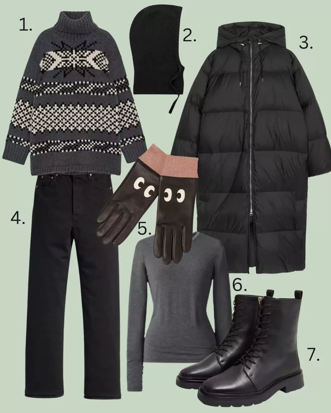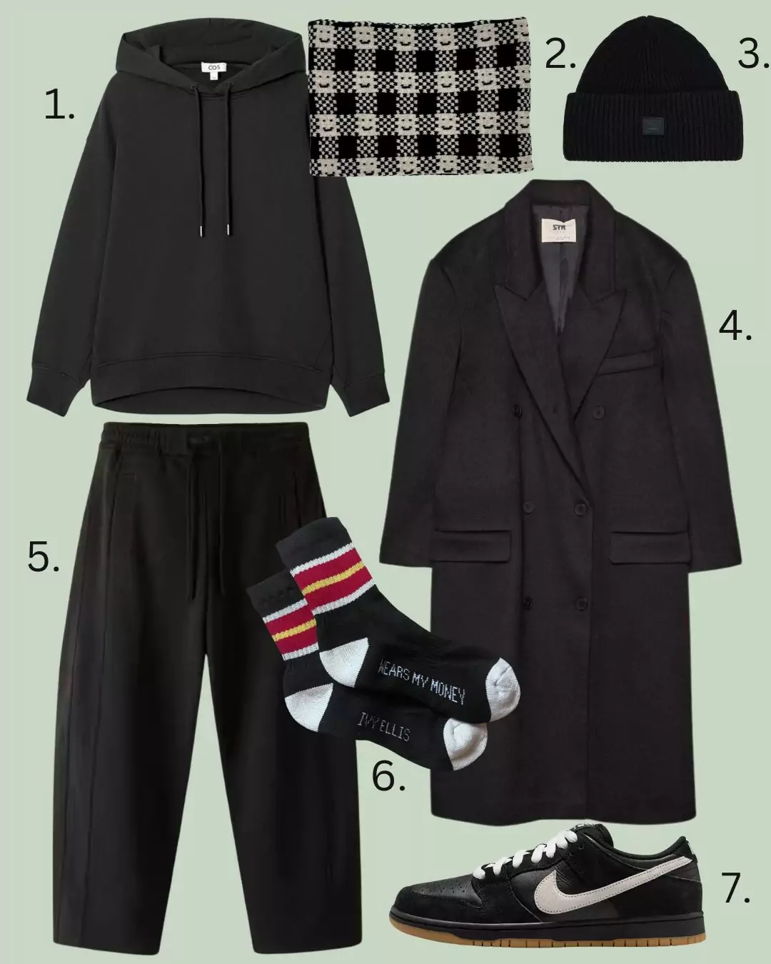 If you are hibernating but you still might need to pop out, then a good-quality loungewear ‘set’ is what you need. The set doesn’t have to match, it should just be in the same colour spectrum. Throw on a hat and a big overcoat for full coverage. A note on coats: I always size up on my winter coats as you need something larger to fit over your layers. No one likes a tight coat as your freedom of movement can be severely restricted.
