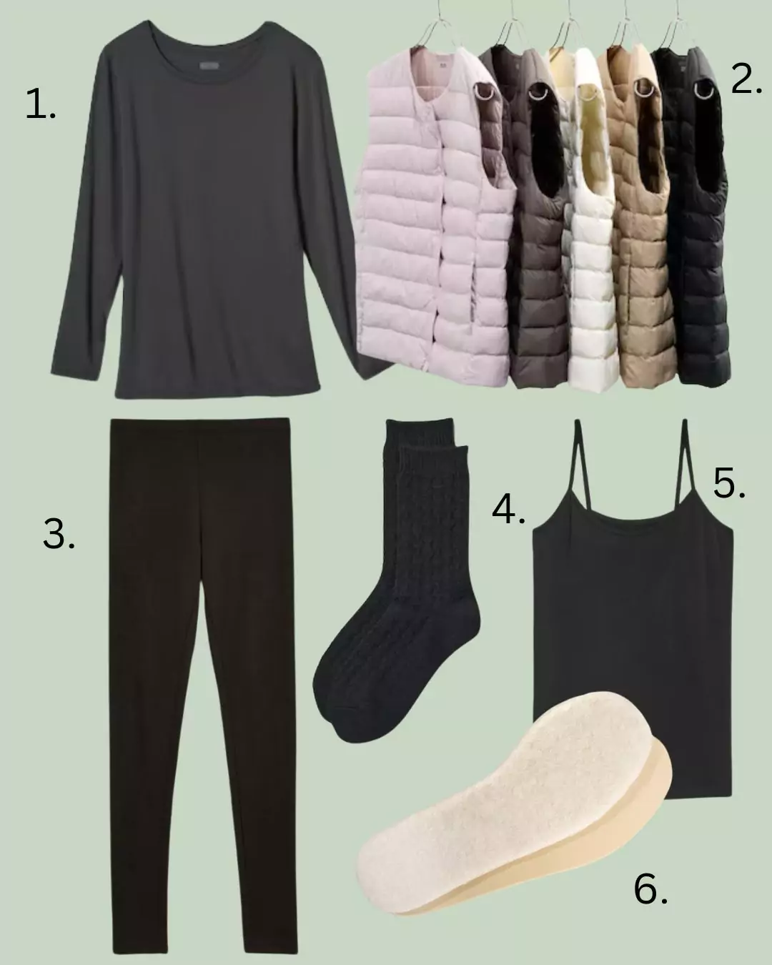 Thermal socks are important but not mandatory; however, I do urge you to seek out sheepskin liners for your shoes as they are game-changers. These are my favourites. Another item I swear by are these Uniqlo body warmers. They are slim enough to be worn under a coat, and the collar folds back so they are practically invisible. They really do give you an extra heat boost.