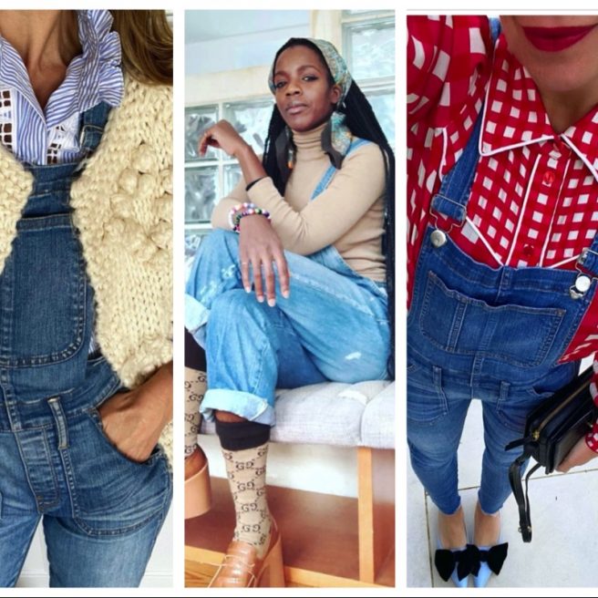 “Ah dungarees. How do I love thee? Let me count the ways. They are my default easy option: I just add a classic knit (crew or polo) for acceptable wfh chic — at least in my book. Or I prettify them with a blouse — which is my usual chosen course (you know my white blouse weakness): The dungarees stop the look from being *too* sickly sweet and girly. Mind you, it took me a few false starts before finding The Ones — I look like my 10 year old daughter or a Cbeebies presenter in baggy dungas — though I love this look on others.”