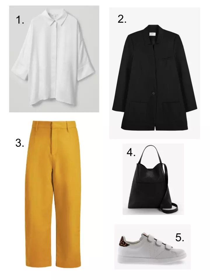 If you are still feeling a bit nervous about wearing yellow so close to your face, then maybe a pair of trousers could be the thing for you? Well, I’m only really thinking about these Kin trousers, because they are my favourites. I have them in Orange from last season.They are such a great shape; wide, without being too wide, tapered at the ankle, and with a little turn up of the hem, the perfect ankle bearing trousers. I’d wear with my wide fit shirt from Cos, which I’m glad to say is still available this season, and a black blazer to smarten it all up.