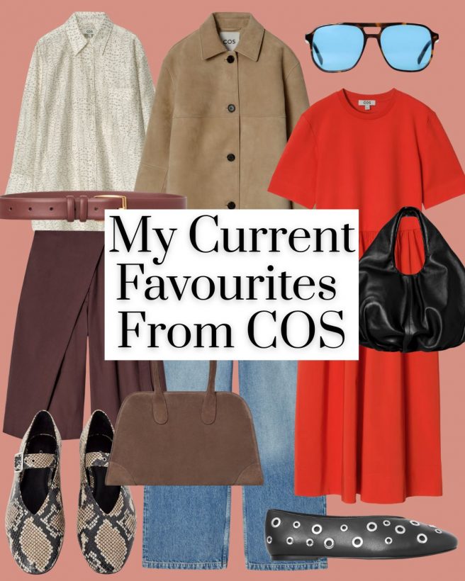 My favourite COS jeans are the Arch Tapered, I have them in cream and dark blue. The best T shirts are this clean cut style — they come in lots of colours and they are just perfect. They also wash really well. For trousers, my favourites are these wide legs. They have the elastic tabs inside them which helps if you are prone to having a fluctuating waist size throughout the year (or is that just me?)