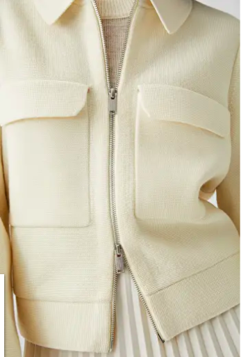 L‑R Cream Pleated Midi Skirt, Green Wool Blend Cardigan, Leather Mini Skirt