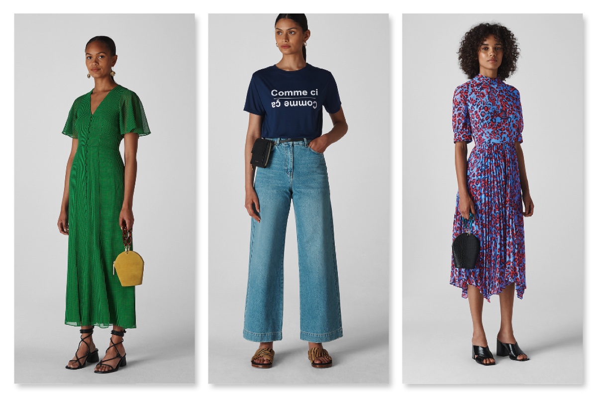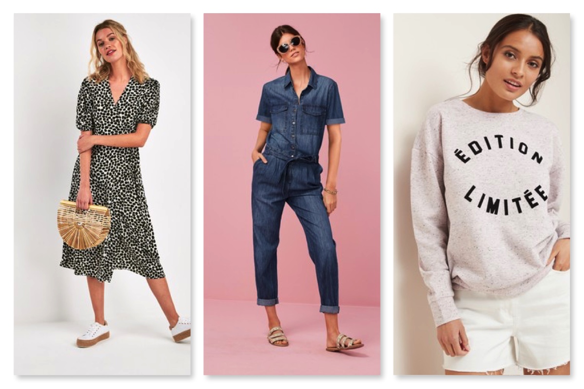 L‑R: Midi Wrap Dress, Denim Boilersuit, Printed Sweatshirt