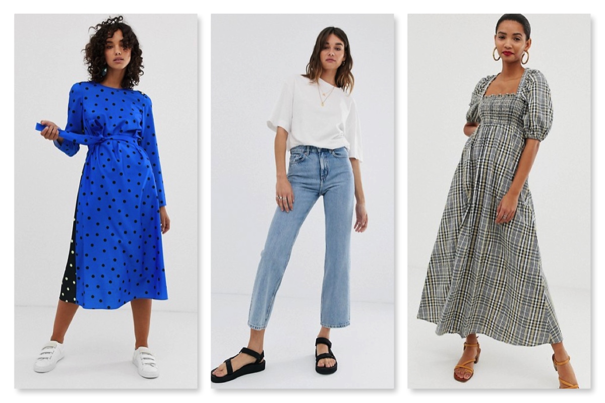 L‑R: Blue Long Sleeve Midi Dress, Weekday Jeans, Shirred Maxi Dress