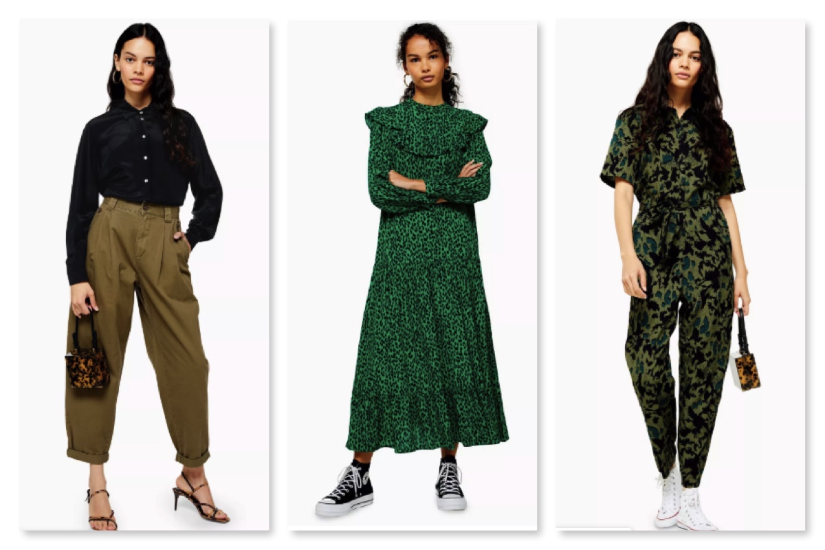 L‑R; Khaki Pleated Front Trousers, Green Leopard Dress, Green Animal Print Jumpsuit