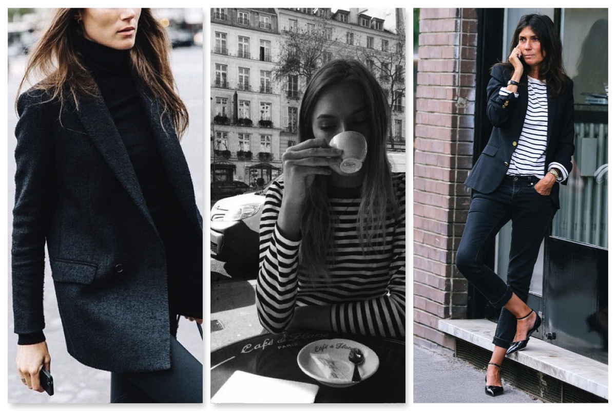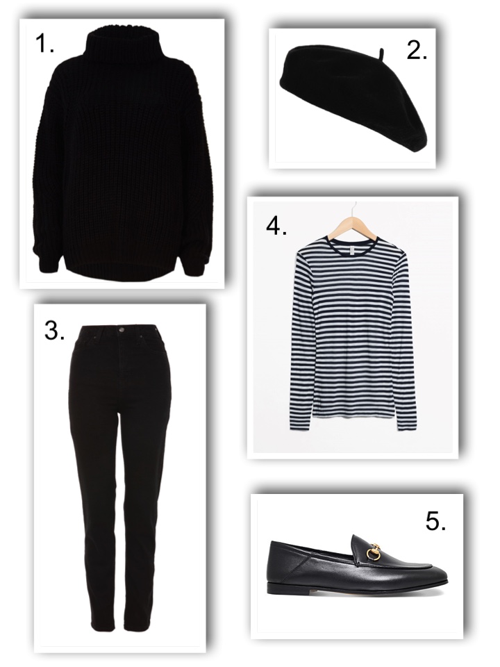 Let’s start with your classic all black Audrey Hepburn in ‘Funny Face’ look. A film I loved so much I modelled my own wedding dress on the one she wore at the end of it. Her most famous look has to be the skinny black trousers, polo neck and loafers. I’m going to add a Beret and a breton for good measure because they are well French innit.