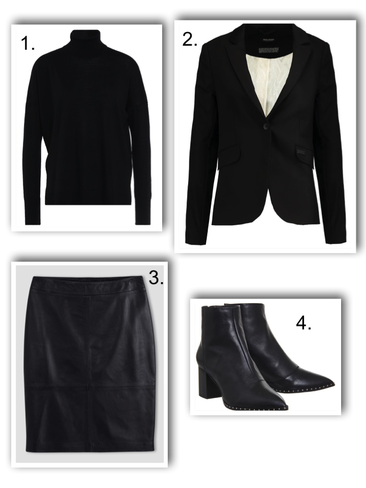 Again with the leather skirt, this time with the classic blazer and poloneck. If Carine Roitfield can still rock a leather pencil skirt at 63, then I’m sure you can. Brave the look with thinner tights instead of falling back on the safer 80 deniers. Pair with your pointy boots. Go all black, it always works.