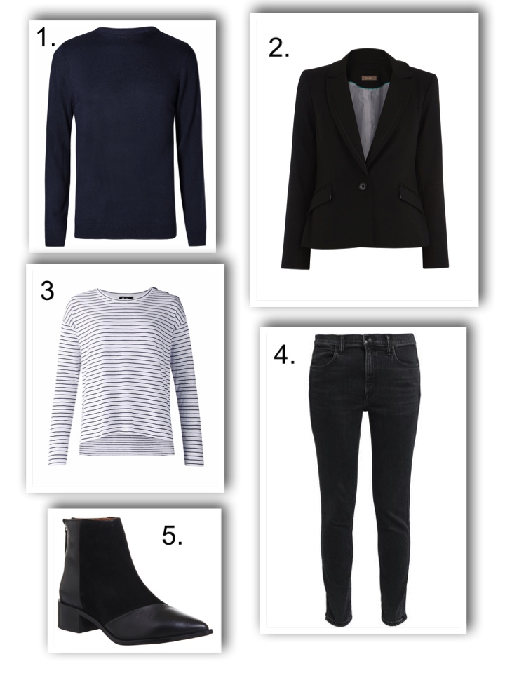 The smart Blazer which I know I’ve wanged on about before, but it will smarten up any outfit I promise you. For your navy jumper, always check out the mens department, they often do a much better selection and sometimes you just want a longer length and something less fitted. M&S Mens dept do great reasonably priced knitwear, as does Uniqlo.