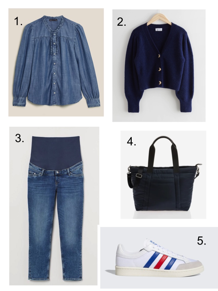 For breastfeeding I’d probably look for button-down shirts and cardigans. As mentioned before, if you’re in a pub garden it will inevitably be quite cold now and you don’t want to get your extremities frozen. So look at the blanket scarf again too. Good for draping over baby as well as keeping you warm. As for nappy bags, waste of money. You really don’t need all those pockets and sections. Just get a good tote bag with a long strap that you can fit over the buggy. Fill it with a selection of cool fabric pouches from Etsy to separate your nappies, wipes etc.