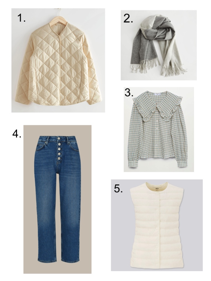 For dresses, thermal ‘secret’ leggings are key. My favourite are the Uniqlo Heattech. Easy to fold up the ankles if you don’t want them to show. For the pub, take a blanket scarf and a packaway vest. You can carry them in a fold-up tote. I love a good fold-up tote bag. You can pop it in your handbag for carrying all your layers around in if you get too hot. I still love a quilted jacket in this weather, I find them to be light yet warm, which is a good thing for April.