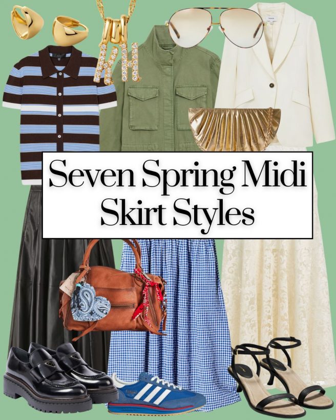 A white midi skirt is THE skirt to have this year. I would recommend getting a simple slip to go under it if you decide to go with this look. Not many of the skirts I have seen are lined, and you could end up with a bit of a Princess Di moment if you don’t double up. Also, white knickers, just like white bras, show up under white clothes – so stick with nude underwear.