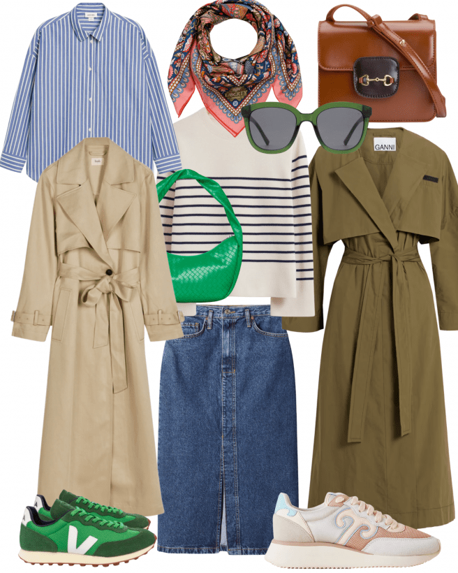 Another classic – some may say boring – look. I am not one of those ‘some people’ as I think a Breton jumper, jeans and a trench is timeless and, therefore, will always be cool. For a bit of interest, add a couple of red accents. Red and khaki go particularly well together.