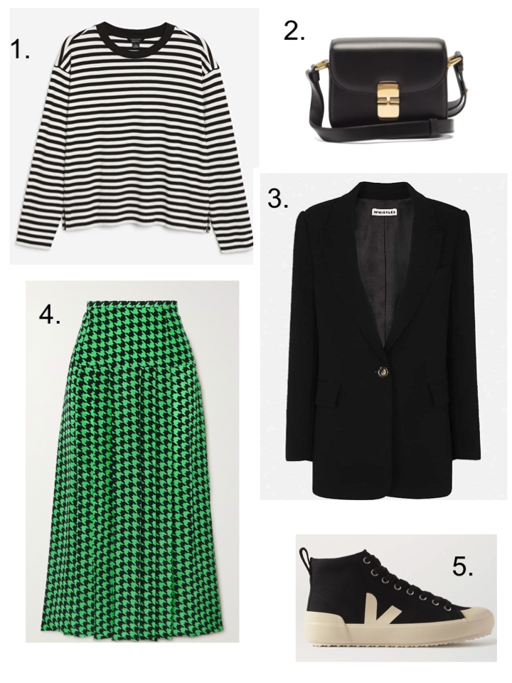 For a higher end skirt, Rixo always does a good range. Love this green houndstooth one. Would work perfectly with a stripe top and a decent (one colour) blazer.