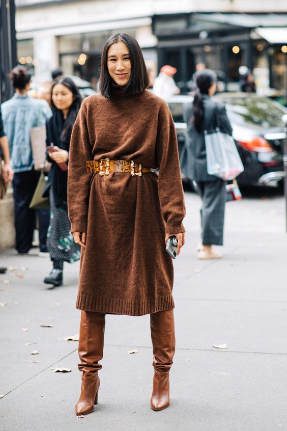 The simple sweater dress. Wear loose or with a belt to give a bit more shape. Personally, I’ve never quite mastered the art of a belted dress. Again, due to lack of waist and inconsequential boobs, but if you’re the curvier sort then this works to give you more definition where it’s needed. I suppose Gok Wan did have a point when he was brandishing a large buckle elasticated belt at ladies wishing to be made over. But I’d say go for a good slim leather belt to add a more stylish detail.