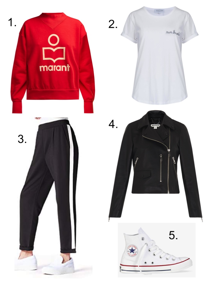These are the side stripe trousers I own. From Amazon of all places! They have their own fashion brand called Find. Who knew? It’s actually pretty decent. I have a great coat from there too that gets a lot of compliments. I wear these trousers with my old faithful Isabel Marant sweatshirt, and now that it’s looking positively Spring-like, I will bring out the leather biker jacket. This one is from Whistles, I still prefer my Set Fashion one, but there’s 20% off Whistles this week for anyone in the market for a decent leather.