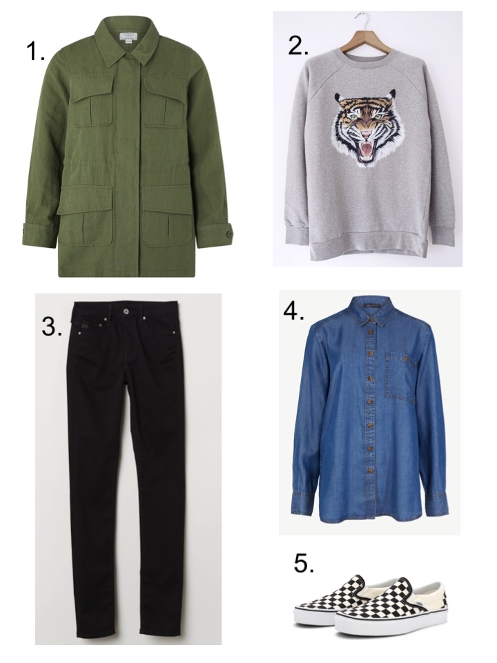 This Jacket is probably my favourite of all the ones I’ve seen recently. It’s a classic loose fit style and just the right colour. It’s from Monsoon of all places.Who would have thought? I’m a firm believer in not overlooking a shop just because you think ‘It’s not really for me’, amongst all the floral dresses (Monsoon) or the black work trousers (Next) or the cropped tops and hot pants (New Look) you can find some diamonds. Although I’m here doing the searching for you, so you don’t have to trawl through those websites for hours on end. This Tiger Sweatshirt is by a small company called Wild Hearts Wonder. Size down if you get it, comes up v big. They also do some really cute little kids clothes and excellent wallpaper!
