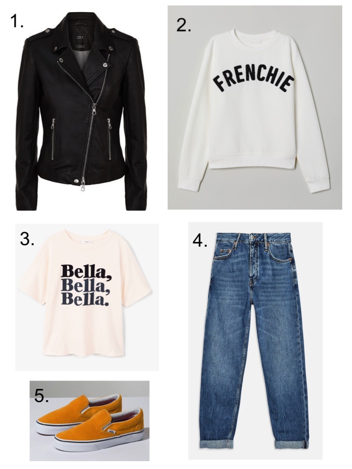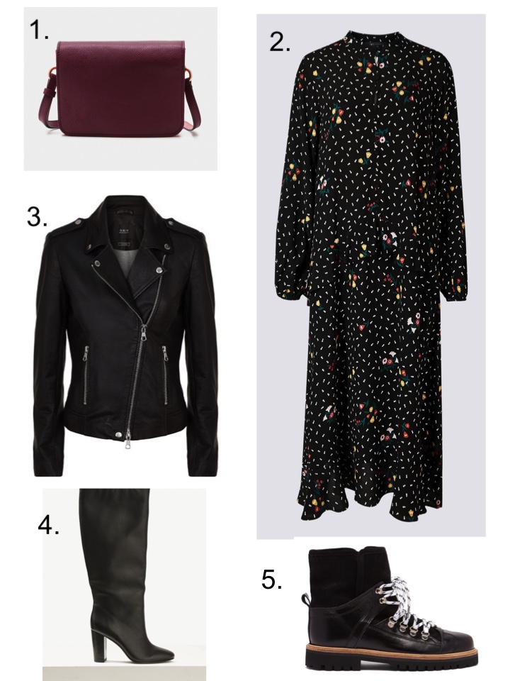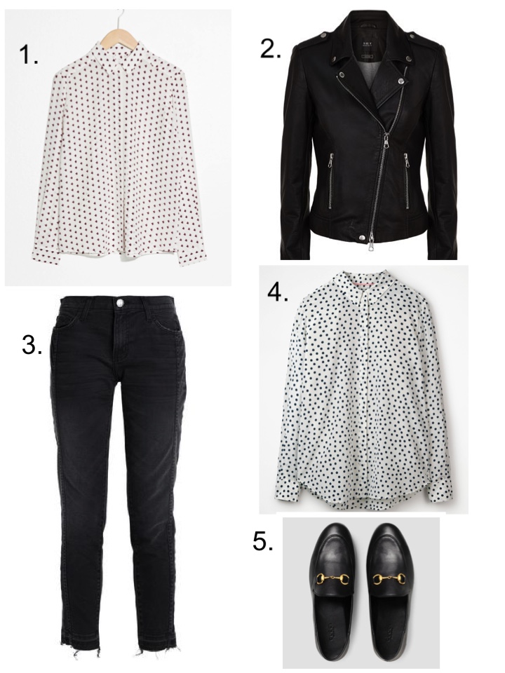 A Black Leather Biker jacket is a wardrobe staple at any age. I went out for dinner last week with 3 other ladies of a certain age and we all turned up separately wearing one of these! You are never too young or too old to wear one. I bought my first one in Kensington Market when I was 15 with the £50 prize money I won in an art competition. I have owned many since then, they have seen me through the goth years, the rock years, the rave years, the toddler years, (remember, leather is a wipe-clean fabric which is a massive bonus for the toddler years!) and I still wear now in the teenage/mid forties years. But enough about me, let’s have a look at how you can style up this jacket in five different ways…(P.S. I will add some cheaper alternative leather and non-leather jackets in the sliding panels under each look)