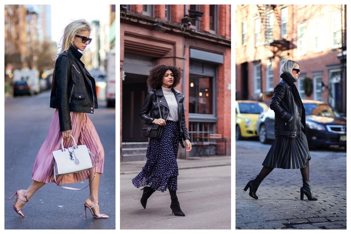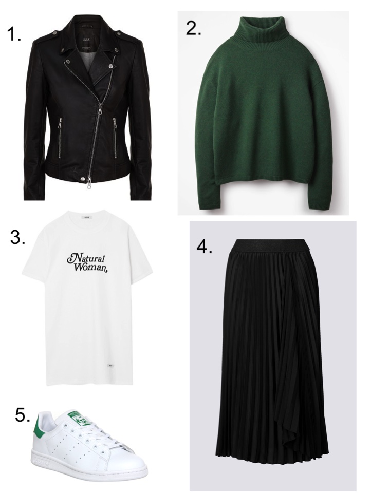 There’s something about a really smart pleated skirt that just goes so well with a biker jacket. I think it’s the smartness of the skirt and the rocker chic of the jacket that just work for me. If weather allows, go for classic Stan Smiths and a T‑shirt. If it’s too chilly, throw on some 100 deniers, a good Chelsea boot and a chunky roll neck. I am looking forward to busting out the polo neck jumpers soon. Instant double chin disguisers!