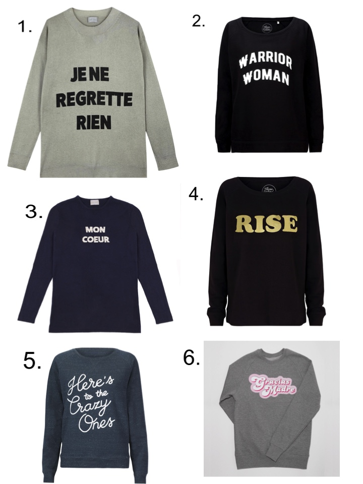 Anyway, I digress, The March. It was great. There were beautiful amazing women everywhere. I mean it, just stunners all over the shop. The Placards were hilarious. To the woman who made that ‘You Look Like A Wotsit Bruv’ sign, I salute you! It got me thinking about Slogan Sweaters and how that’s one way of quite literally expressing ourselves through our outfits. Who says fashion is shallow? Here’s my pick from some lovely small businesses…