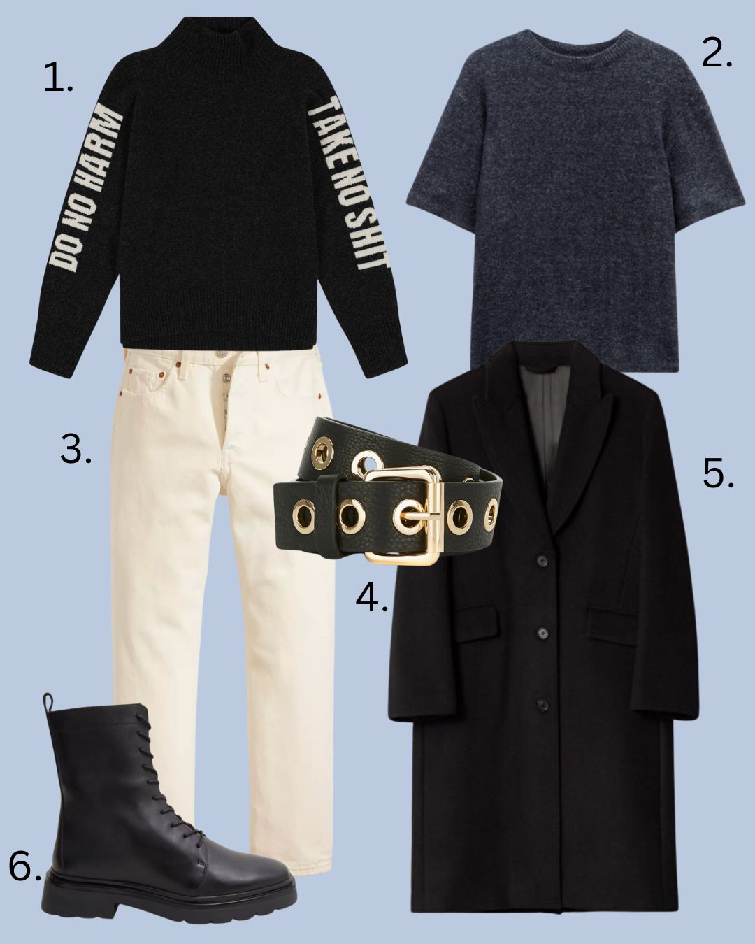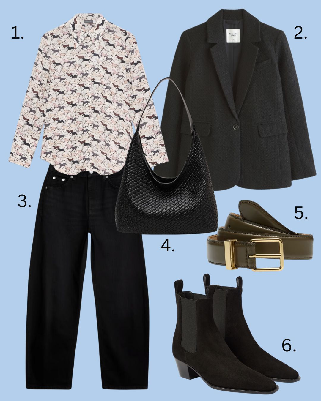 You could have full-length barrel jeans for this one, but slightly cropped is still my preferred length. Look for a pair of ankle boots that are pointed and maybe slightly western without being TOO cowboy. They need to be fitted close to the ankle so they sit nicely under the hem of your jeans. These Toteme ones are the ideal shape and style for reference, but they are also not cheap (to put it mildly) so I have some other options below too.