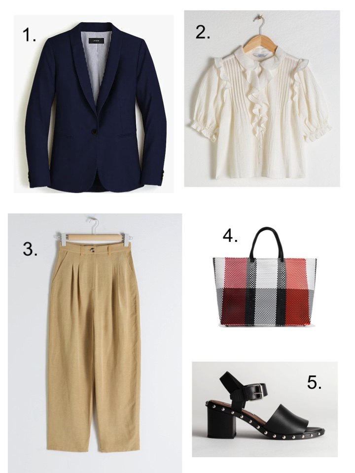 For me, throwing on a blazer automatically makes an outfit smart. Add a decent blouse and a heel and you’re work ready. I’ve said before that J Crew make excellent blazers. Not cheap, I grant you, but they are classic, well designed and fit perfectly (take your regular size), so worth the money. & Other Stories do a great range of decent blouses and their silk shirts are also worth a look for office wear.