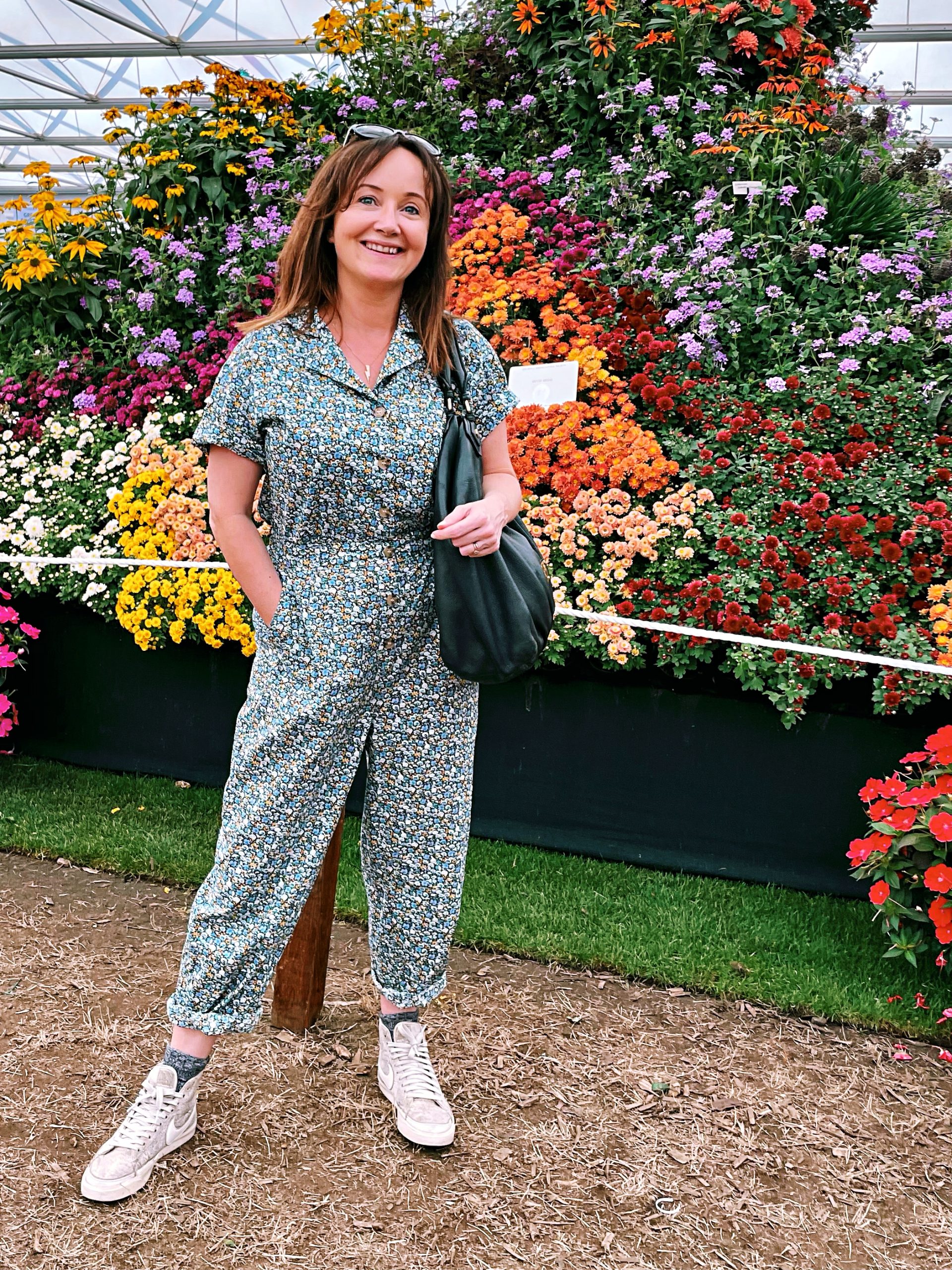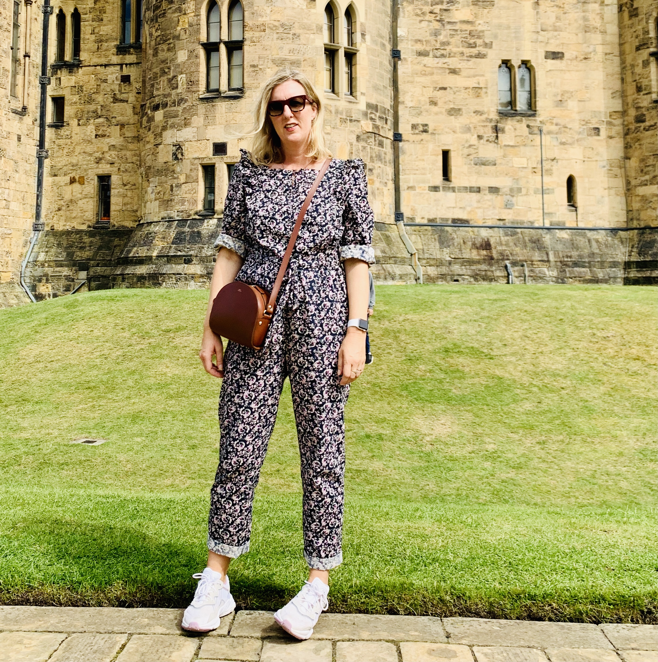 For those with more of a sense of adventure clothing-wise, why not try a printed jumpsuit to stand out from the crowd? If you’re concerned about your expanding tummy area (I mean, who isn’t when you get past 40?), then look for looser fitting jumpsuits with a tie-waist belt. I like to tie it slightly above the thickest part of my stomach so the belt-ties cover the bulge and, with the addition of a busy print, it hides everything you want hidden. I’m wearing my Iris Sasha jumpsuit from 2020 above. In front of a castle (of course).