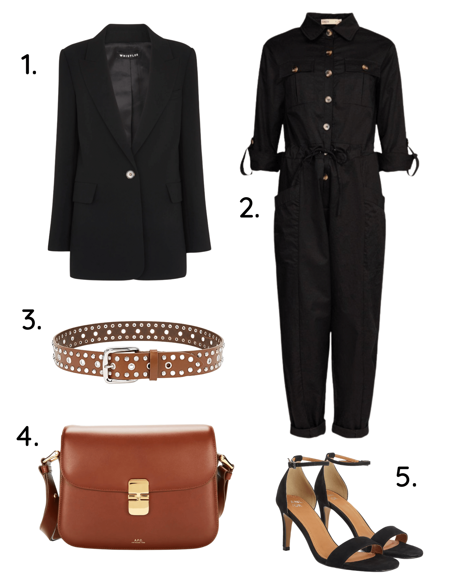 I’m not really sure if there is a difference between a boiler suit and jumpsuit. In my head a boiler suit is looser fitting and a bit more casual. Saying that, I think you can wear it in many ways. Here’s a more dressed-up look below. Pair your classic boiler suit with some strappy heels and a blazer and swap out the fabric tie-belt for a more upmarket one that can elevate the look so easily. I love a piece of clothing that can work for any occasion. I love this one from Oasis, but special mention has to go to ME + EM for this navy satin cotton one and, for high summer, this lightweight cheesecloth one.