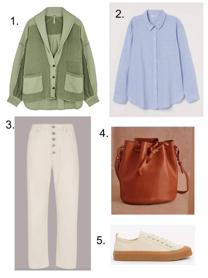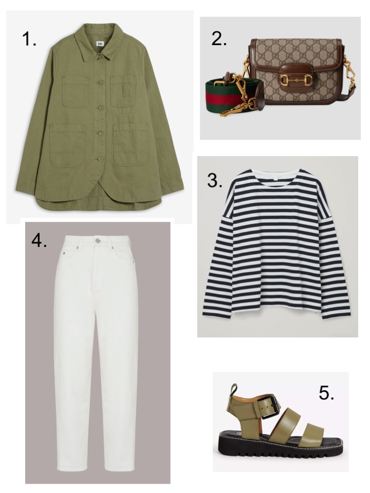 By ‘classics’, I mean mix some items from the 15 Piece Spring Capsule Wardrobe with your white jeans. In this case, the Breton top and the khaki jacket. If in doubt, get them both out: they work every time, I promise you. I can vouch for these John Lewis Kin sandals as being VERY comfortable. They have a great padded footbed for all day walking, should you wish to be out and about soon.