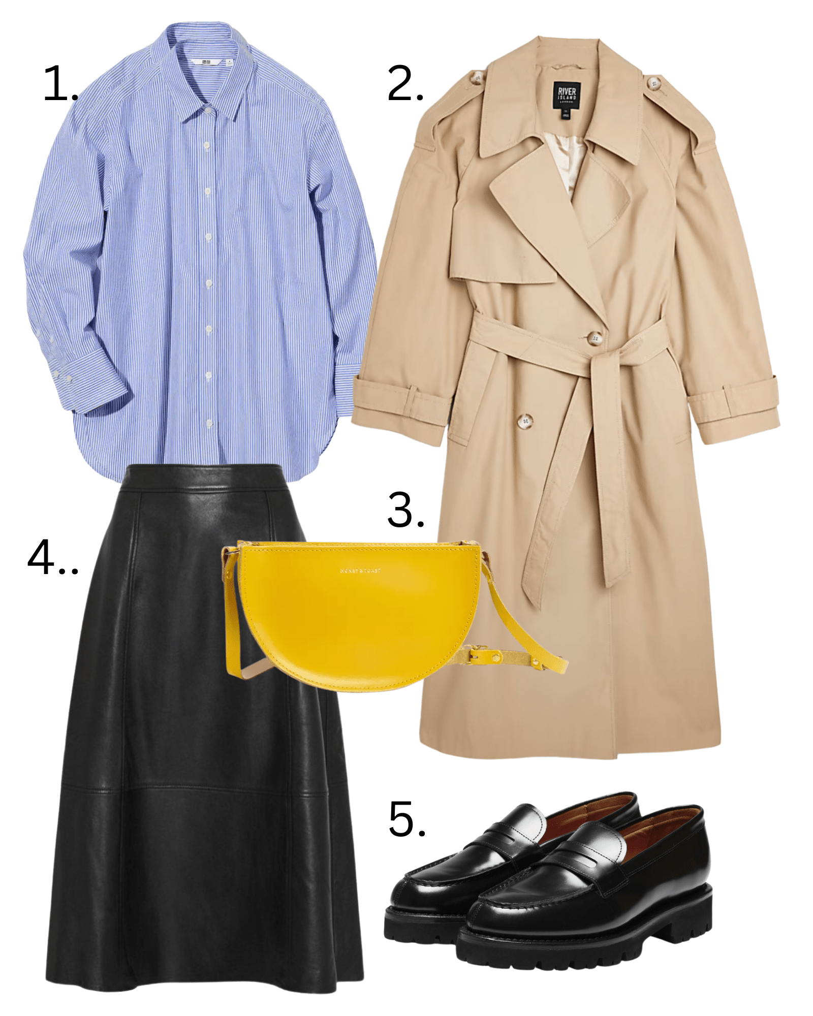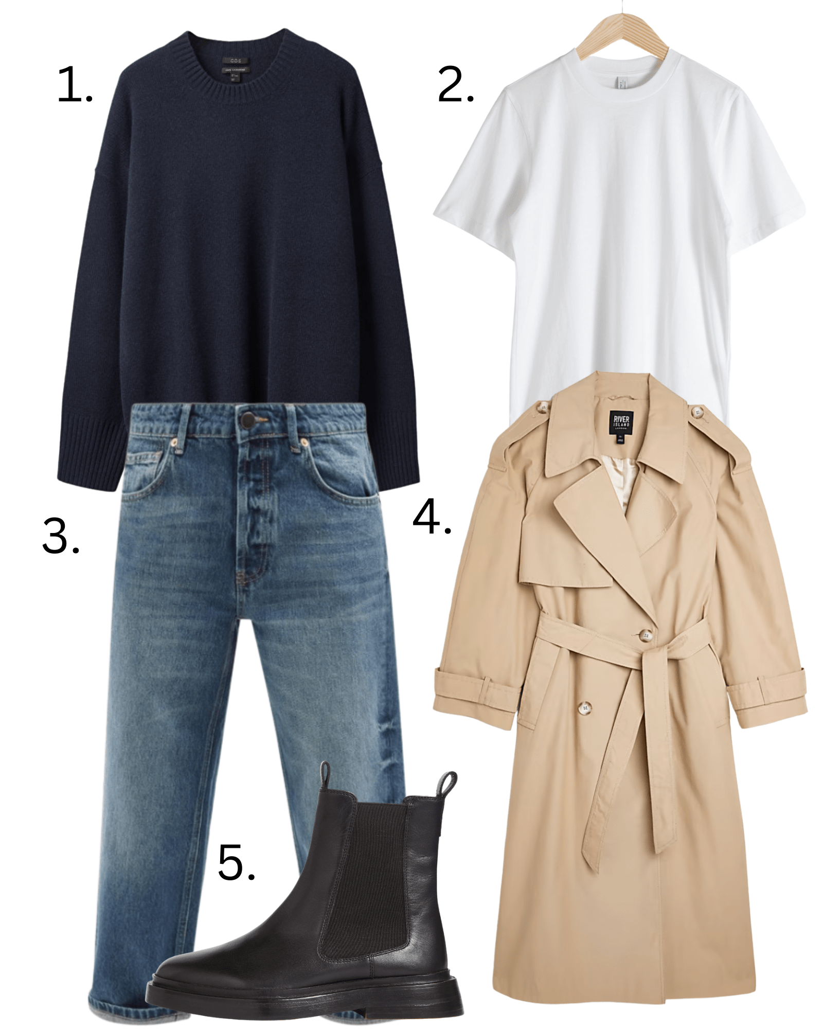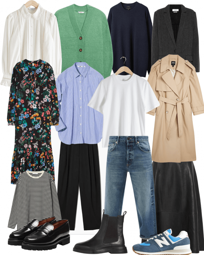 OVERCOAT/TRENCH: I’m saving proper coats for the winter capsule guide, especially as I’m going through the hot flash stage of the perimenopause right now – I don’t need anything too thick and heavy until we dip into single-temperature figures in the daytime. I have a great khaki trench from M&S back in 2016; the most similar I can find is this one. I also like the look of this oversized cream one from River Island.