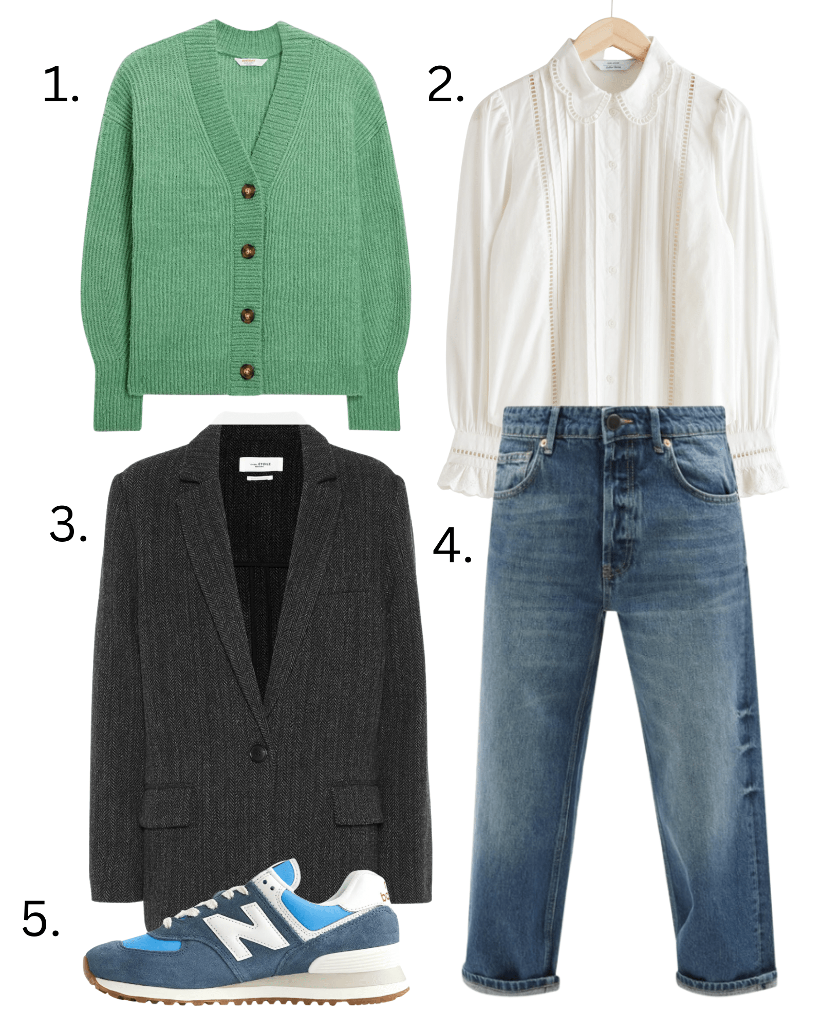 NICE BLOUSE: Personally, I’d go with one of my white ruffle-type blouses from & Other Stories here as I like a bit of frou-frou every now and then, and I have a few! This one is probably most like the older ones I have, but you could go with your favourite leopard or floral blouse.